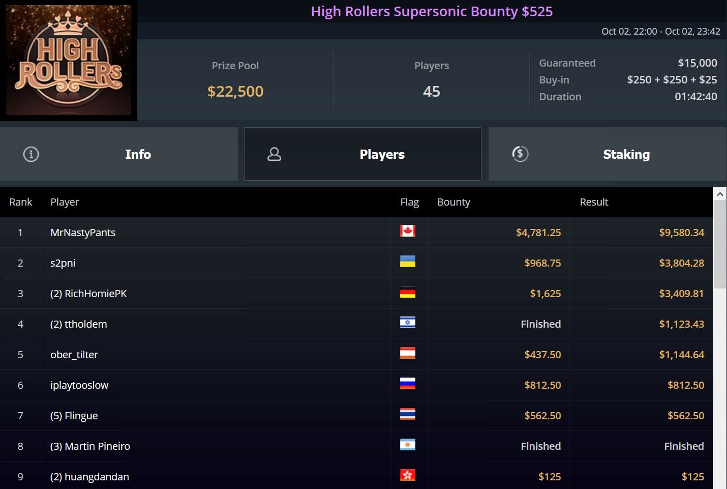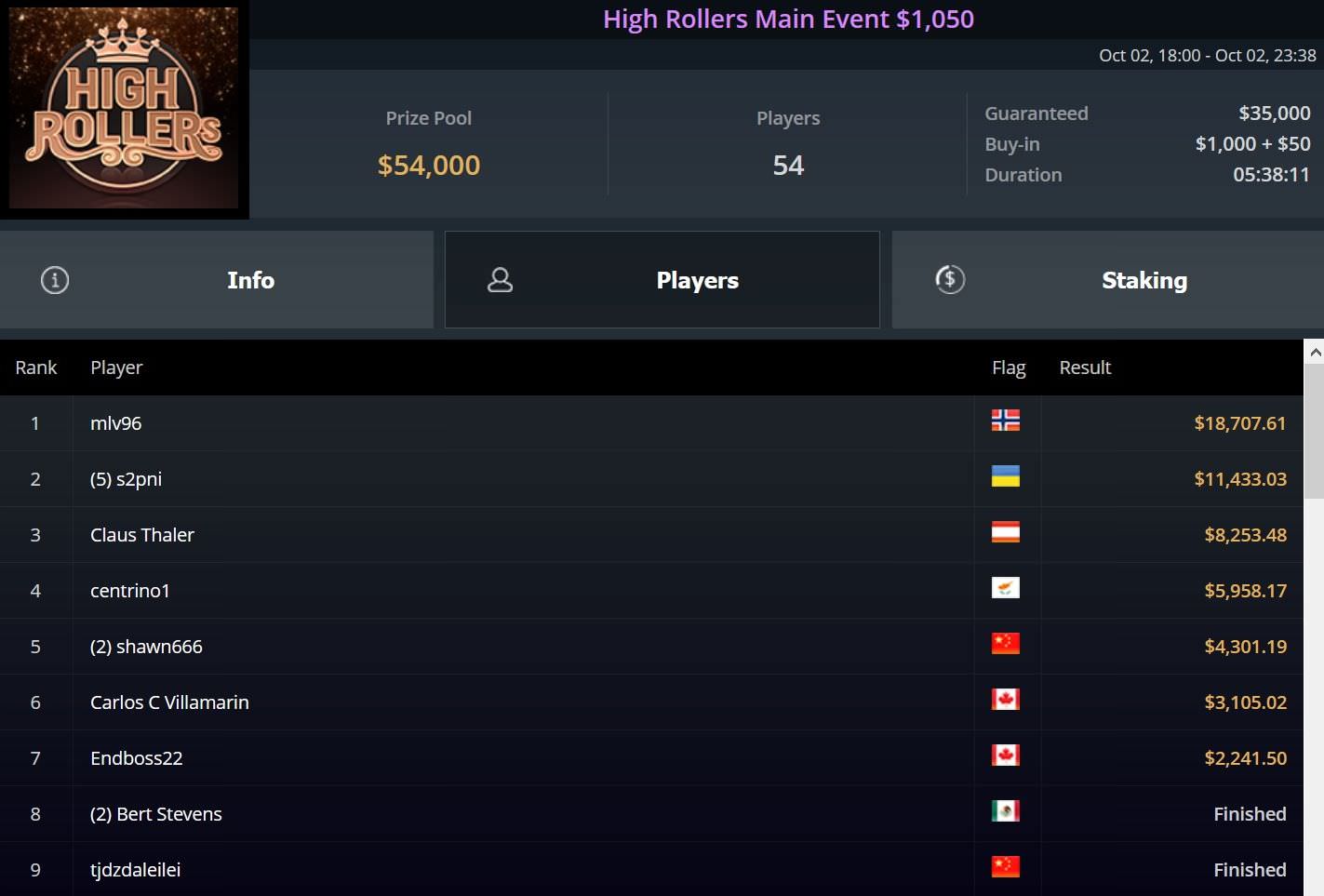 „Claus Thaler“ belegte beim $1.050 High Rollers Main Event den dritten Platz und erhielt gut $8.000 Preisgeld, während „RichHomiePK“ beim $525 Supersonic Bounty ebenfalls Dritter wurde und rund $5.000 kassierte.