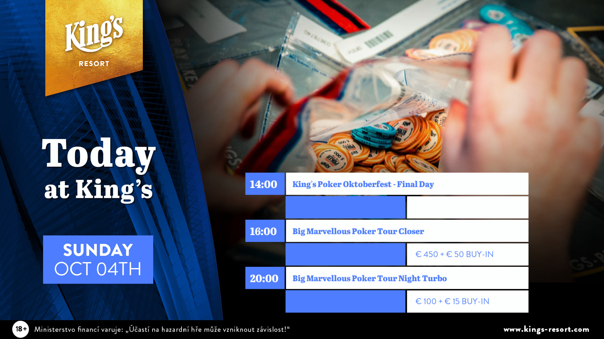 Heute werden im King’s Resort neben dem Finaltag beim €175 King’s Oktoberfest (14 Uhr) noch das €500 BMPT Closer (16 Uhr) sowie das €115 BMPT Night Turbo (20 Uhr) gespielt.