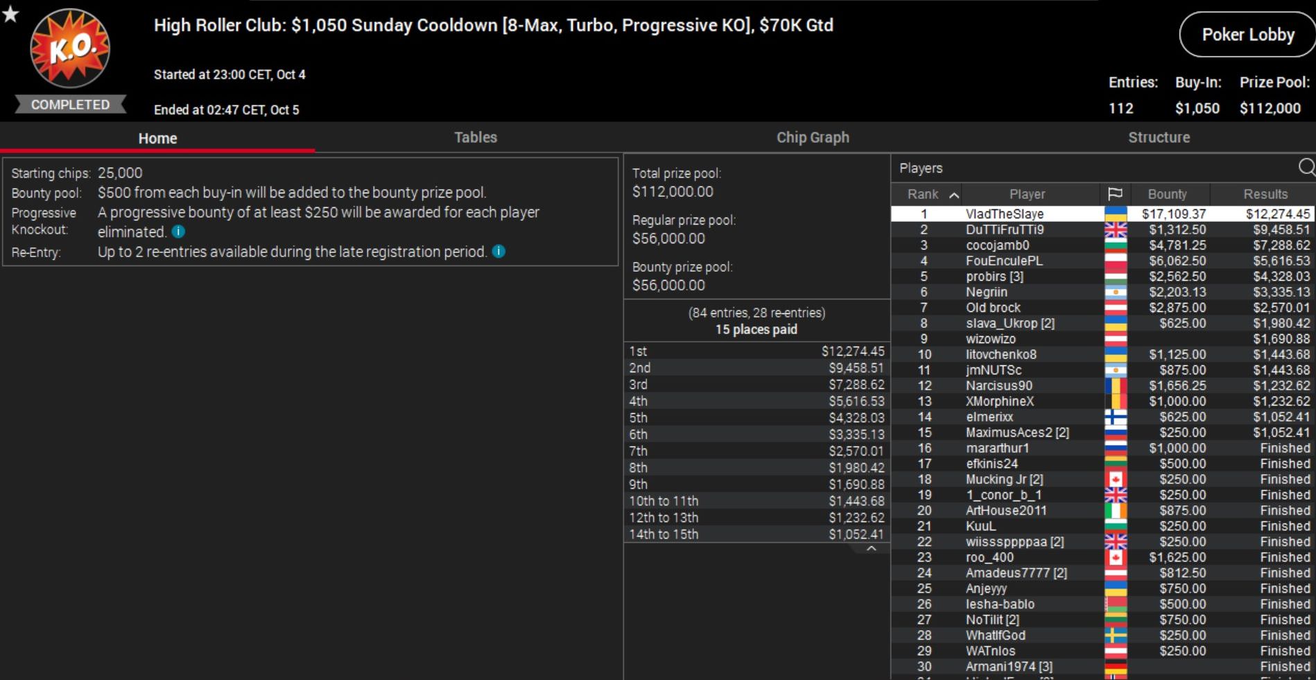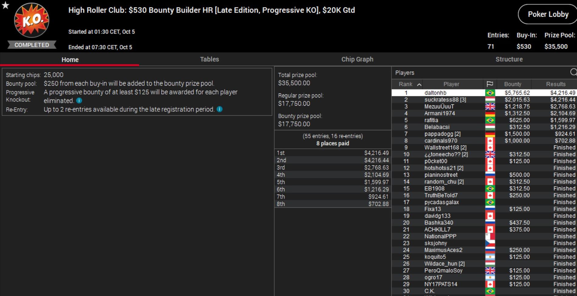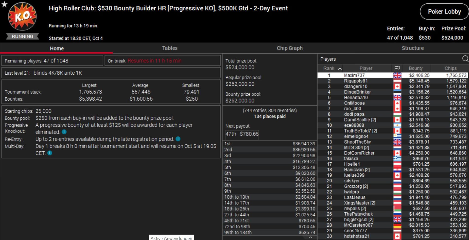 Eine weitere Spitzenplatzierung aus DACH-Sicht holte „Armani1974“ beim $530 Bounty Builder Late Edition.