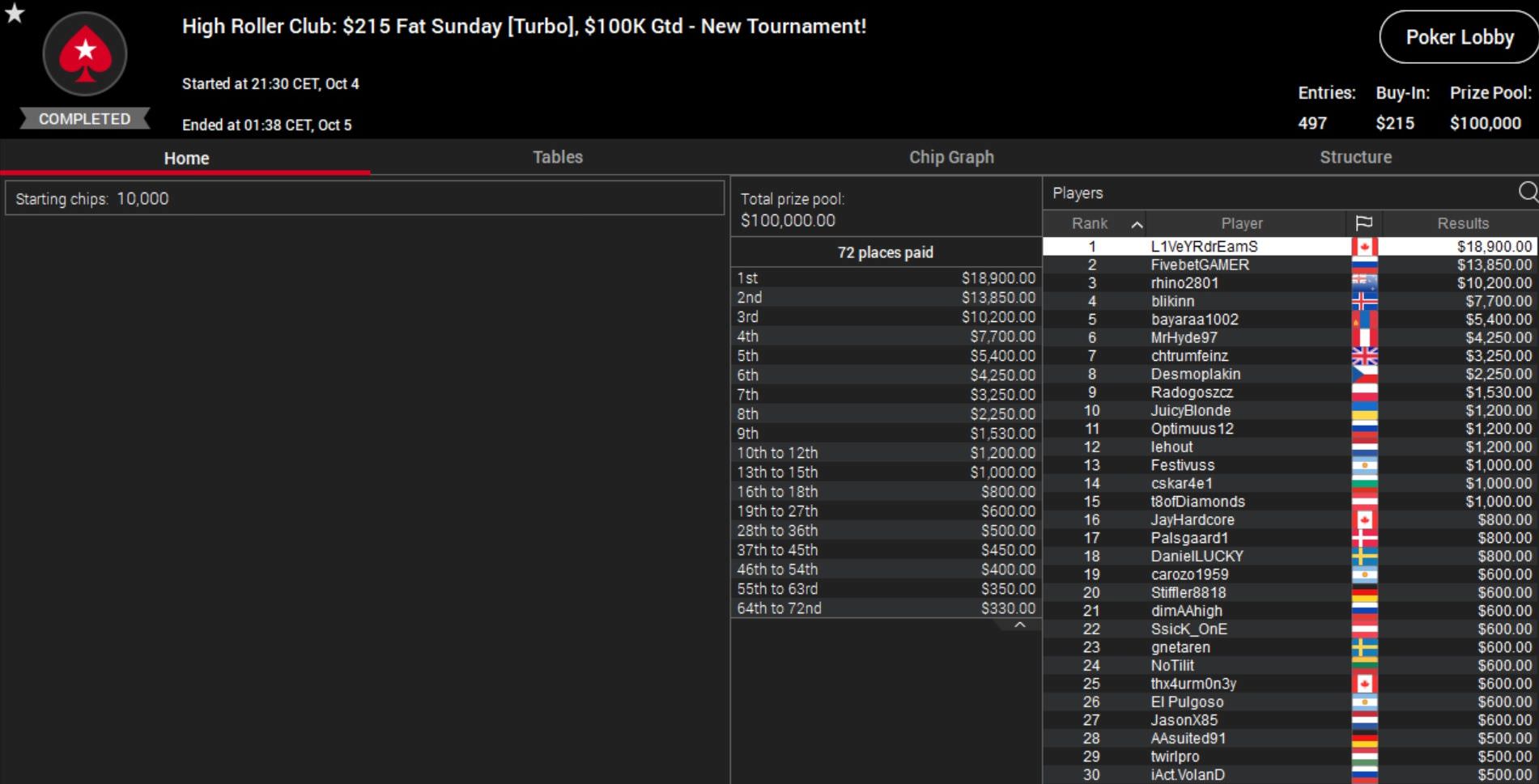 Neu eingeführt wurde das $215 Fat Sunday, bei dessen Premiere immerhin $100.000 garantiert wurden.