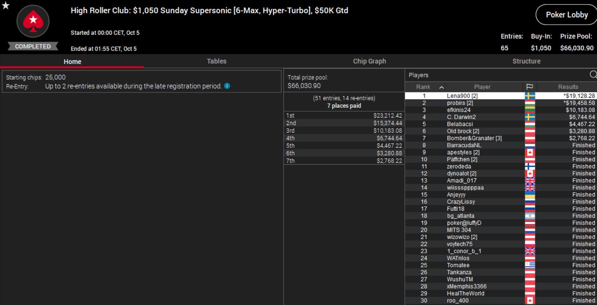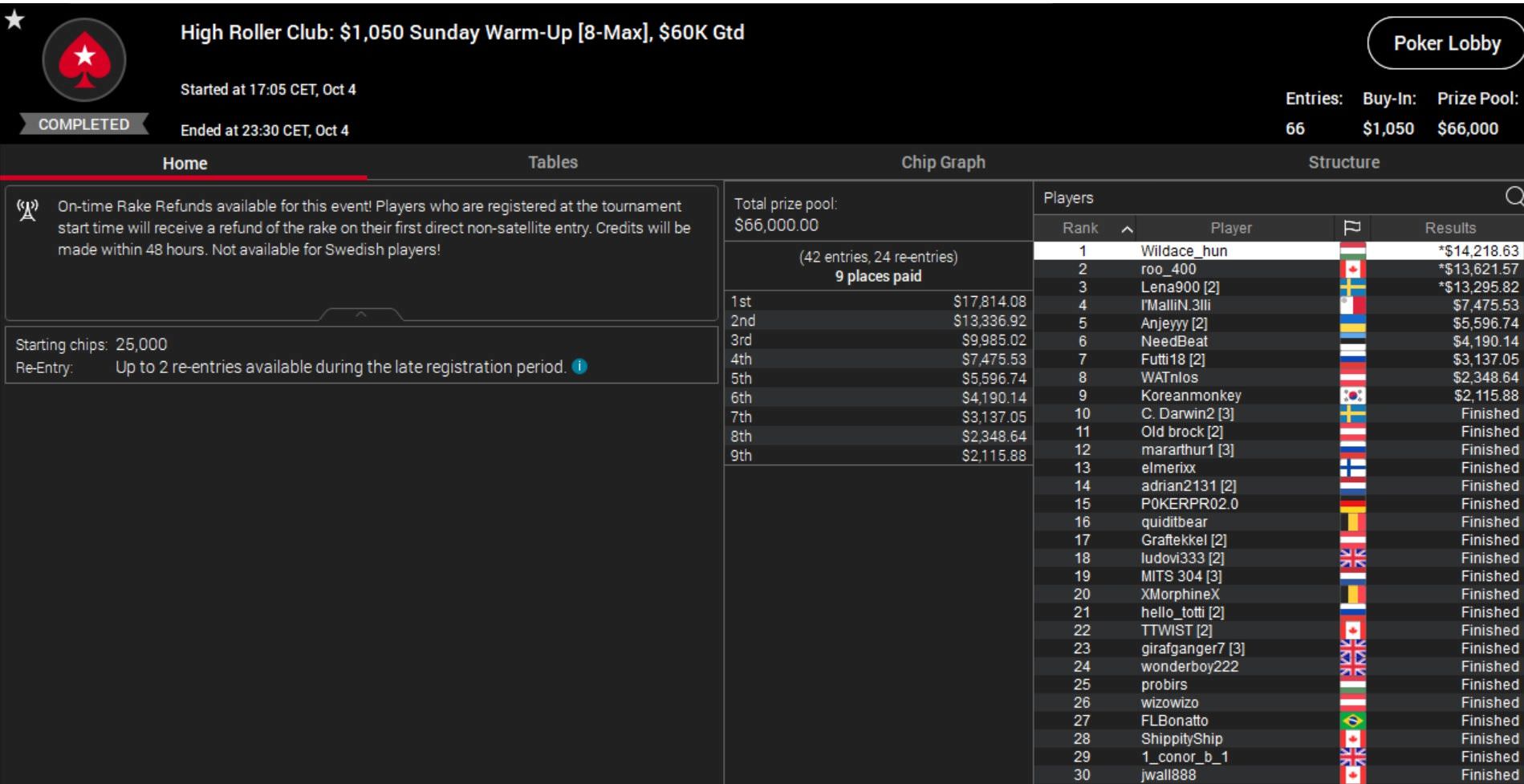 Mann des Tages war allerdings einmal mehr der Schwede Niklas „Lena900“ Astedt, der jeweils nach Deal beim $1.050 Warm-Up Dritter und beim $1.050 Supersonic Erster wurde. Insgesamt räumte er so über $33.000 ab