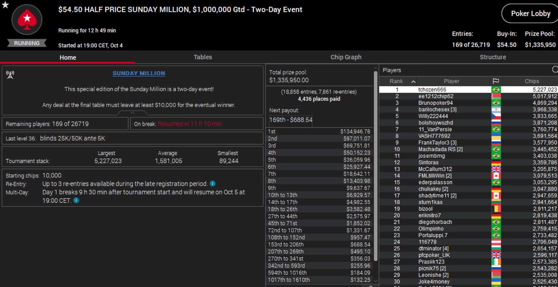 Wie üblich auf zwei Tage angesetzt waren der $530 Bounty Builder und die $54,50 Half Price Sunday Million, an der sich 26.719 Entrys beteiligten.