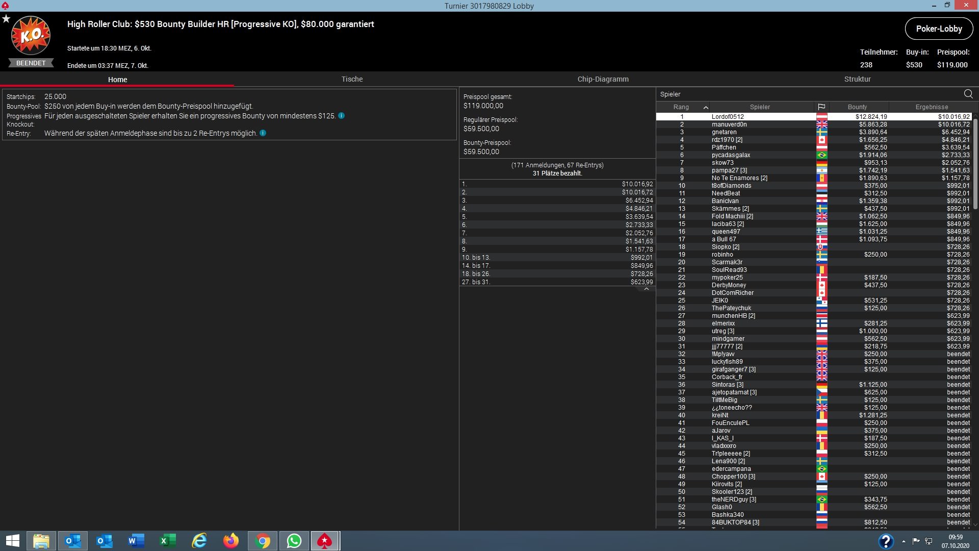Das größte Preisgeld kam am Dienstag mit $119.000 beim $530 Bounty Builder High Roller zusammen. Hier konnte sich der Österreicher „Lordof0512“ gegen 237 Gegner durchsetzen und das Turnier für $10.016 + $12.824 Bounties gewinnen. Außerdem schafften es noch Pascal „Päffchen“ Hartmann (GER/AUT – Platz 5 – $3.639 + $562 Bounties) und „skow73“ (GER – Platz 7 – $2.053 + $953 Bounties) an den Final Table.