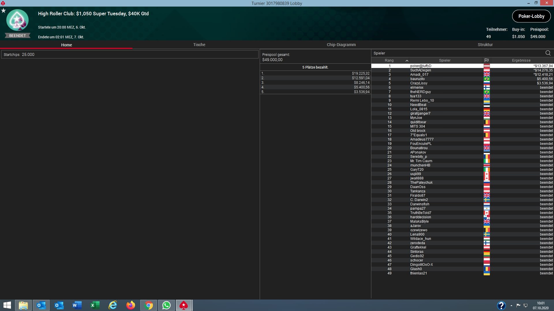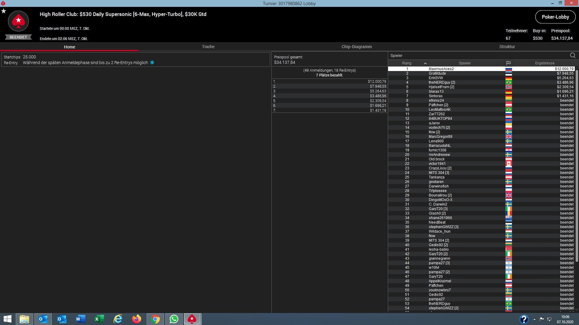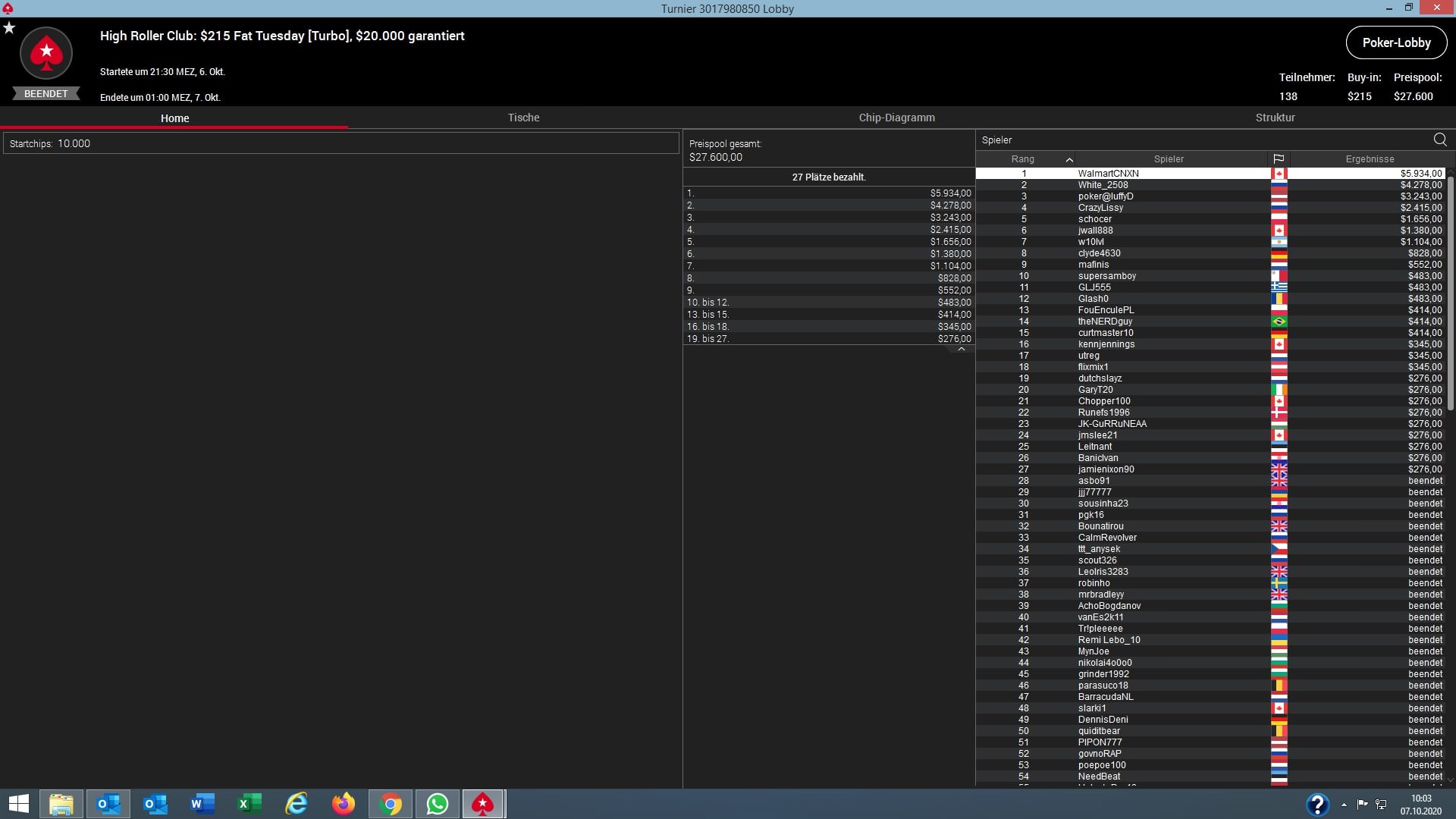 Der Sieg beim $215 Fat Tuesday ging dieses mal an den Kanadier „WalmartCNXN“ für $5.934. Platz 8 belegte der Deutsche „clyde4630“ für $828.