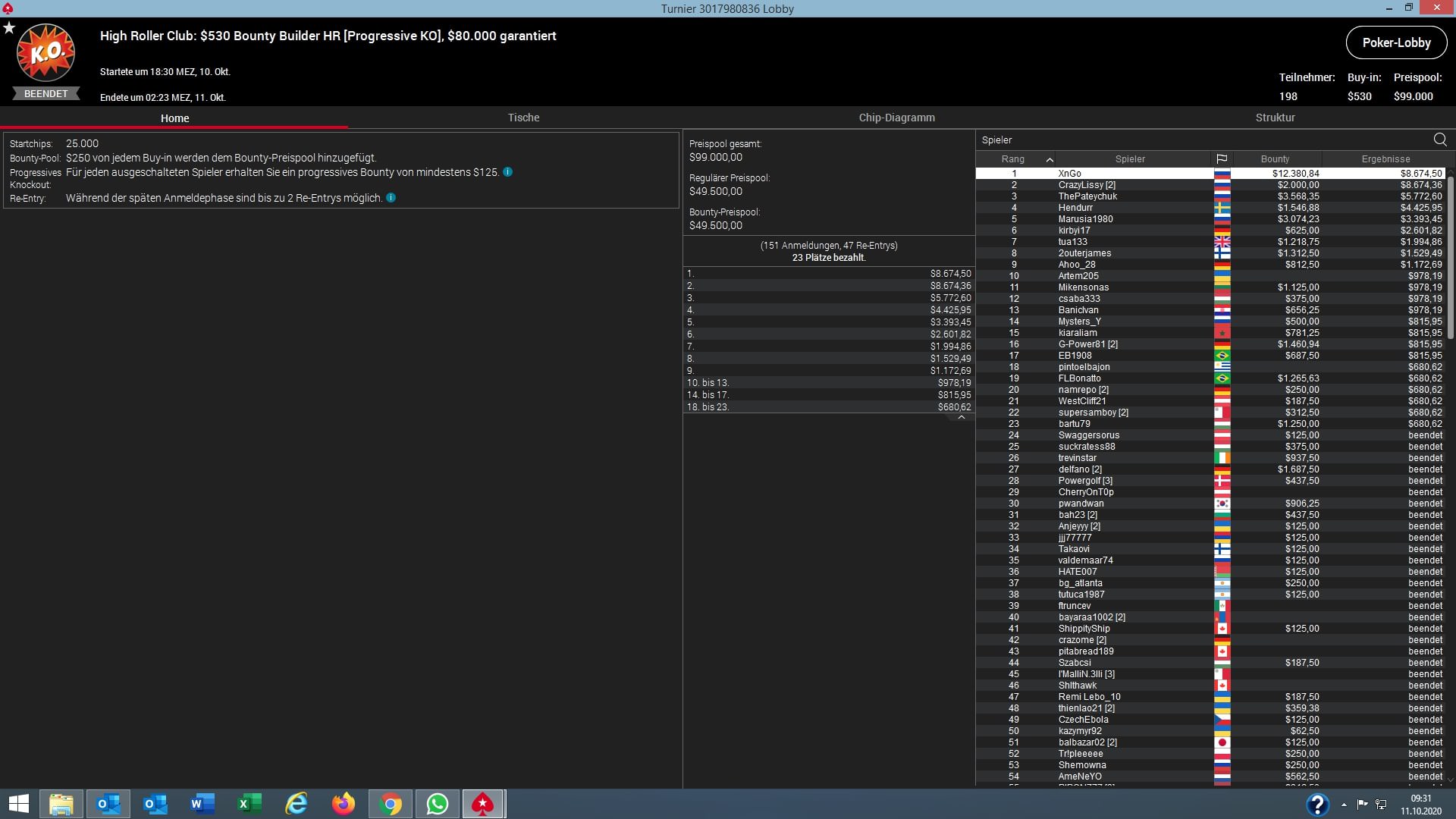 Wie gewohnt war beim $530 Bounty Builder High Roller noch am meisten los. 198 Entries bauten einen Preispool von $99.000 auf. Den Titel und $8.674 + $12.000 Bounties sicherte sich der Russe „XnGo“. Bester DACH-Spieler wurde der Deutsche „kirbyi17“ auf Platz 6 für $2.601 + $625 Bounties.