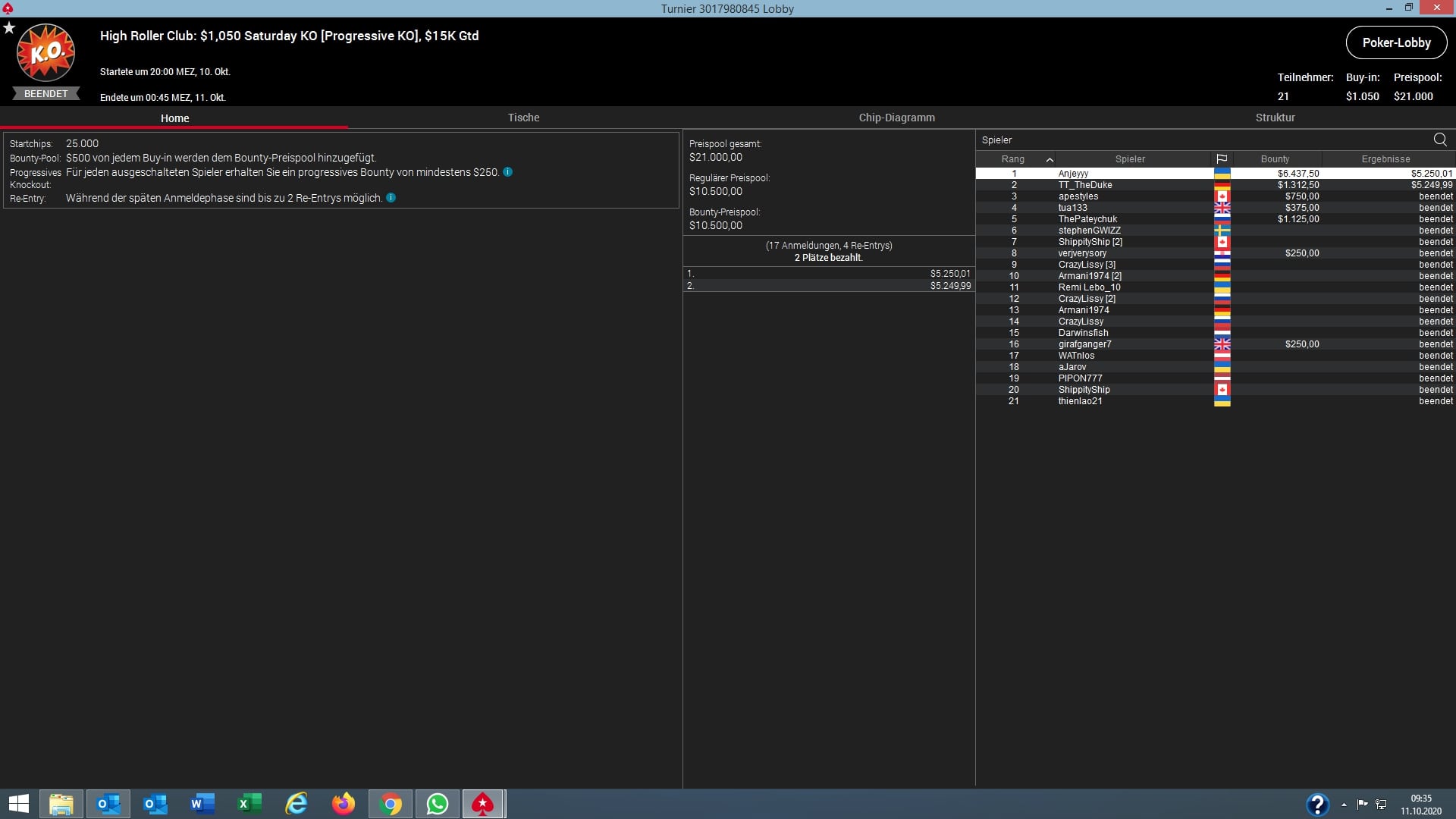 Fast hätte es für einen deutschen Sieg gereicht. „TT_TheDuke“ musste sich beim $1.050 Saturday KO nur dem Ukrainer Andrey „Anjeyyy“ Novak geschlagen geben und wurde als Runner-Up mit $5.250 + $1.312 entlohnt.