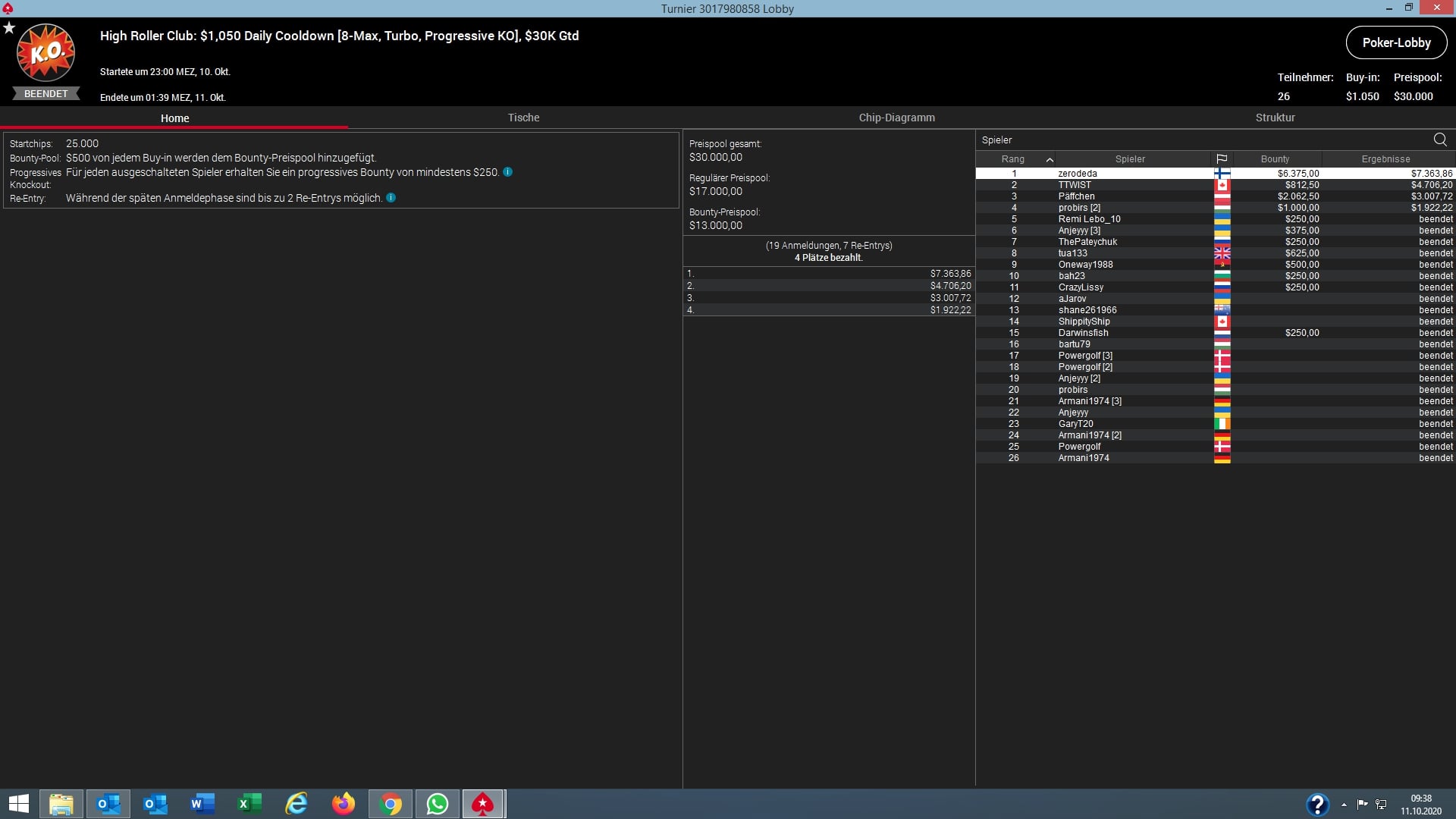 Das $1.050 Daily Cooldown lockte nur 26 Spieler an und so gab es ein kleines Overlay und es wurden die garantierten $30.000 ausgespielt. Pascal „Päffchen“ Hartmann (GER/AUT) schaffte es hier bis auf Platz 3 für $3.007 + $2.062 Bounties. Der Sieg und $7.363 + $6.375 Bounties gingen nach Finnland an „zerodeda“.