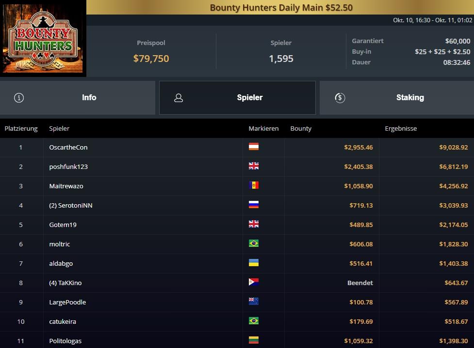 Beim $52,50 Bounty Hunter Daily Main Event triumphierte der Österreicher „OscartheCon“ und kassierte $9.028 + $2.955.