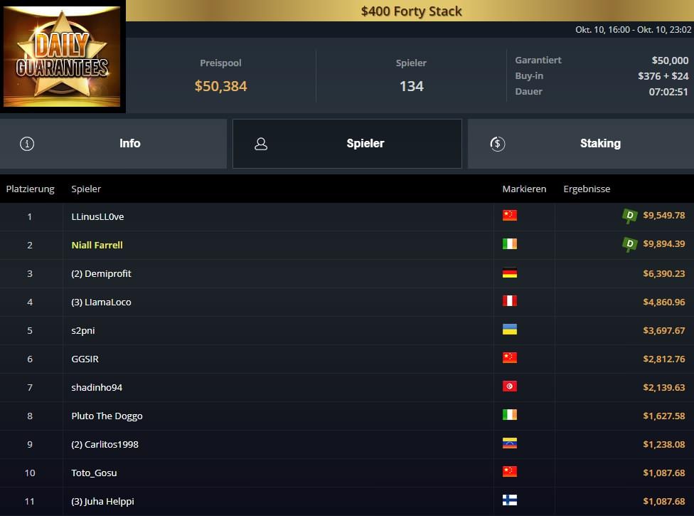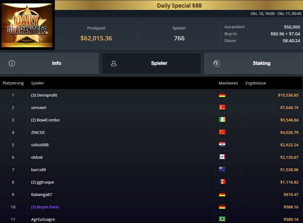 Einen weiteren Sieg für die DACH-Spieler gab es für „Demiprofit“ (GER) beim $88 Daily Special, was dem Deutschen ein Preisgeld von $10.536 einbrachte. Anschließend wurde er noch Dritter beim $400 Forty Stack und holte sich weitere $6.390.