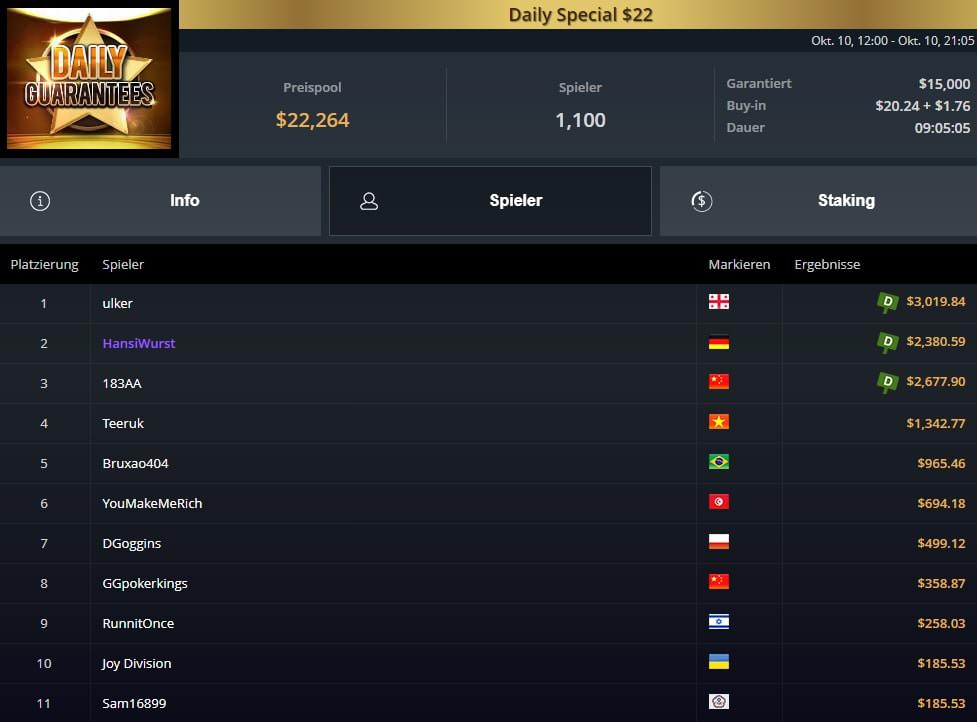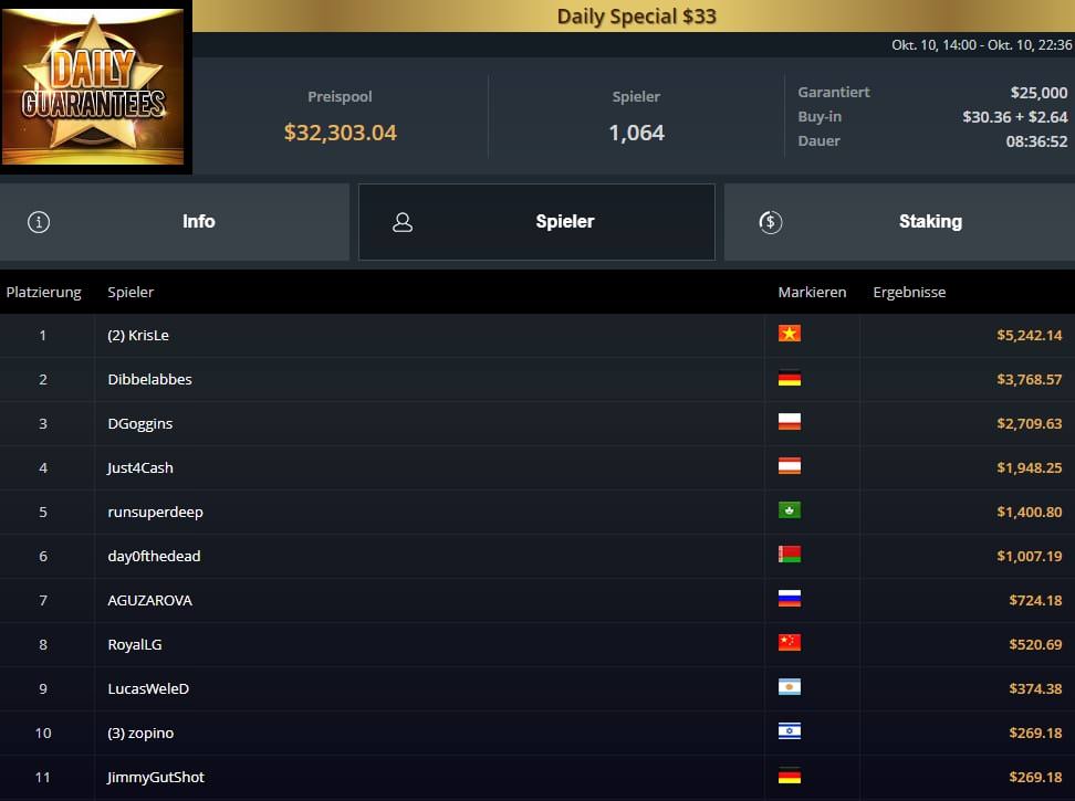 Dann holte sich „Dibbelabbes“ (GER) noch Platz 2 beim $33 Daily Special und räumte $3.768 ab.