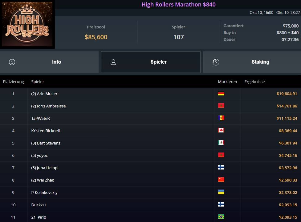 Auch der Deutsche „Ariemuller“ durfte sich über einen High Rollers Titel freuen. Er gewann das $840 High Rollers Marathon für $19.604.