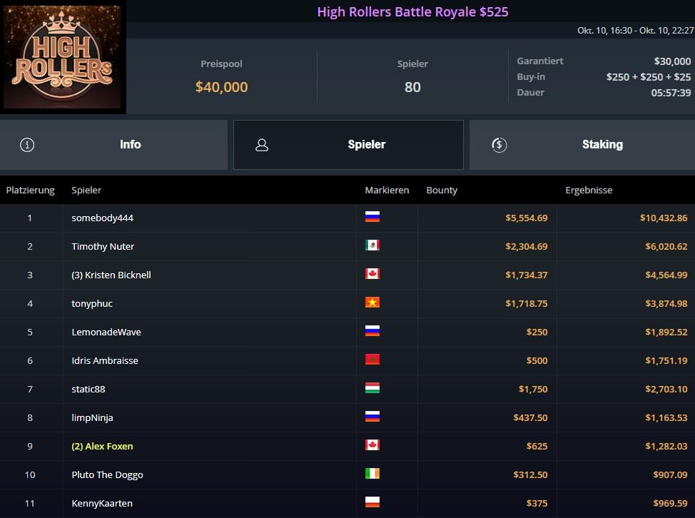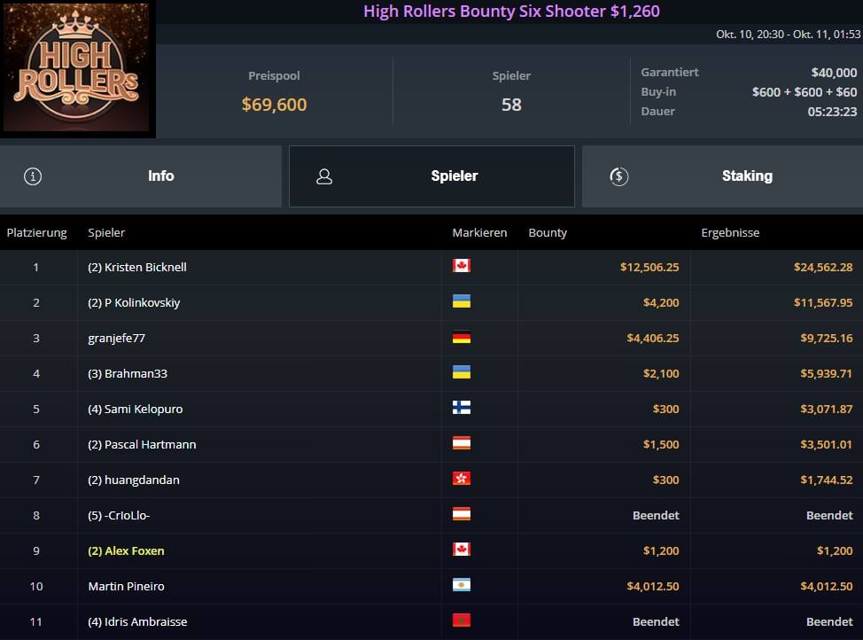 Kristin Bicknell sicherte sich beim $1.260 High Rollers Six Shooter den Sieg und $24.562 + $12.506 Bounties. Beim $525 High Rollers Battle Royal legte sie dann noch einen Platz 3 für $4.564 + $1.734 Bounties nach.