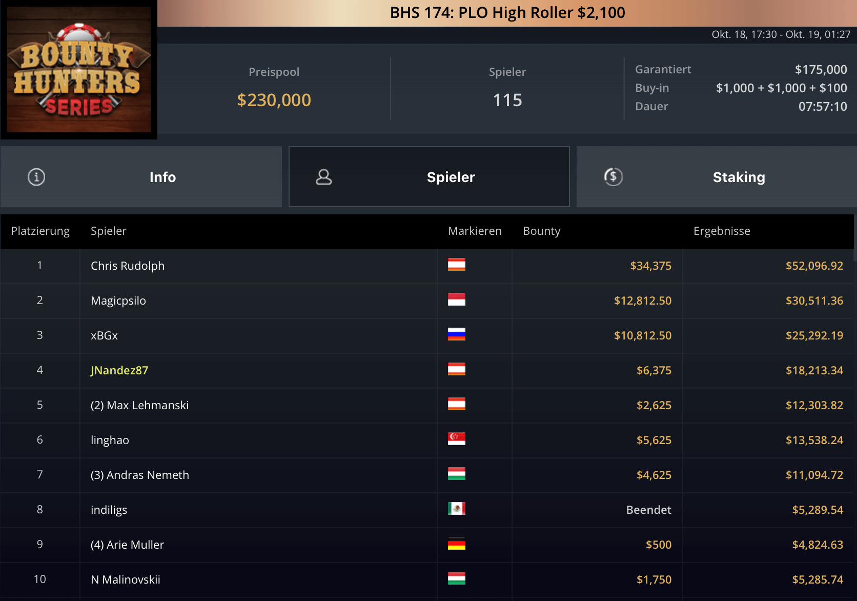Rudolph schnappte sich das $2.100 High Roller mit Vier Karten. 115 Entries entschieden sich für das PLO-Turnier mit $230.000 Preispool und Rudolph holte sich den Titel. $52.096 gab es für den Sieg und mit Bounties gewann er nochmals $34.475. Fernando „JNandez87“ Habegger platzierte sich auf Platz 4 für insgesamt $14,5k.