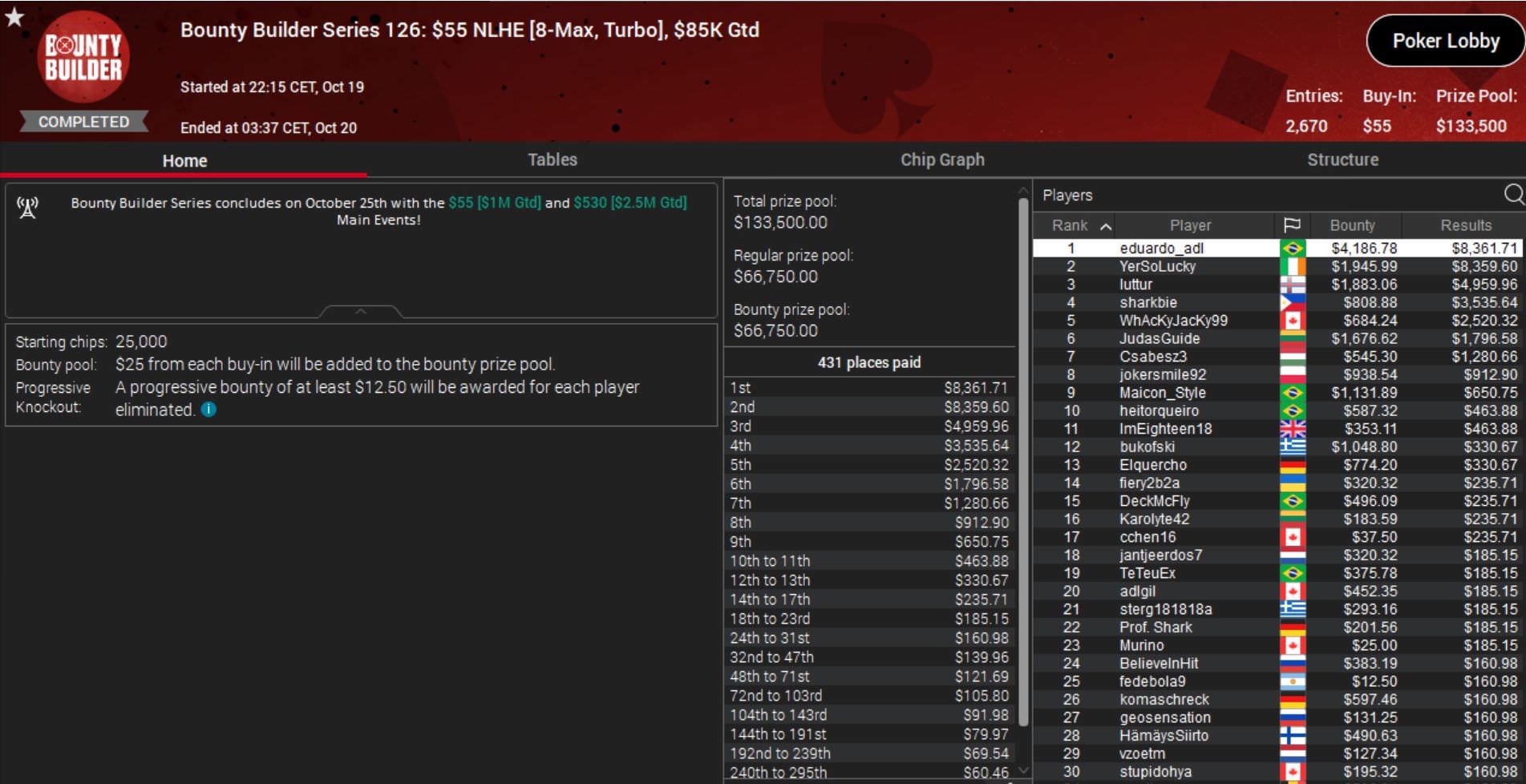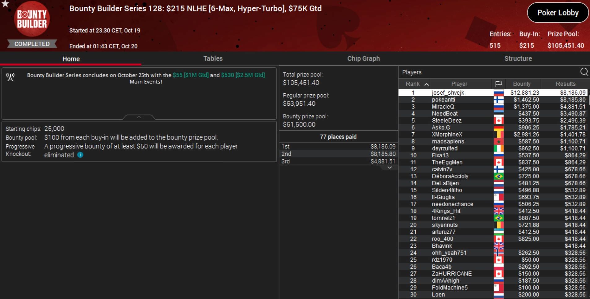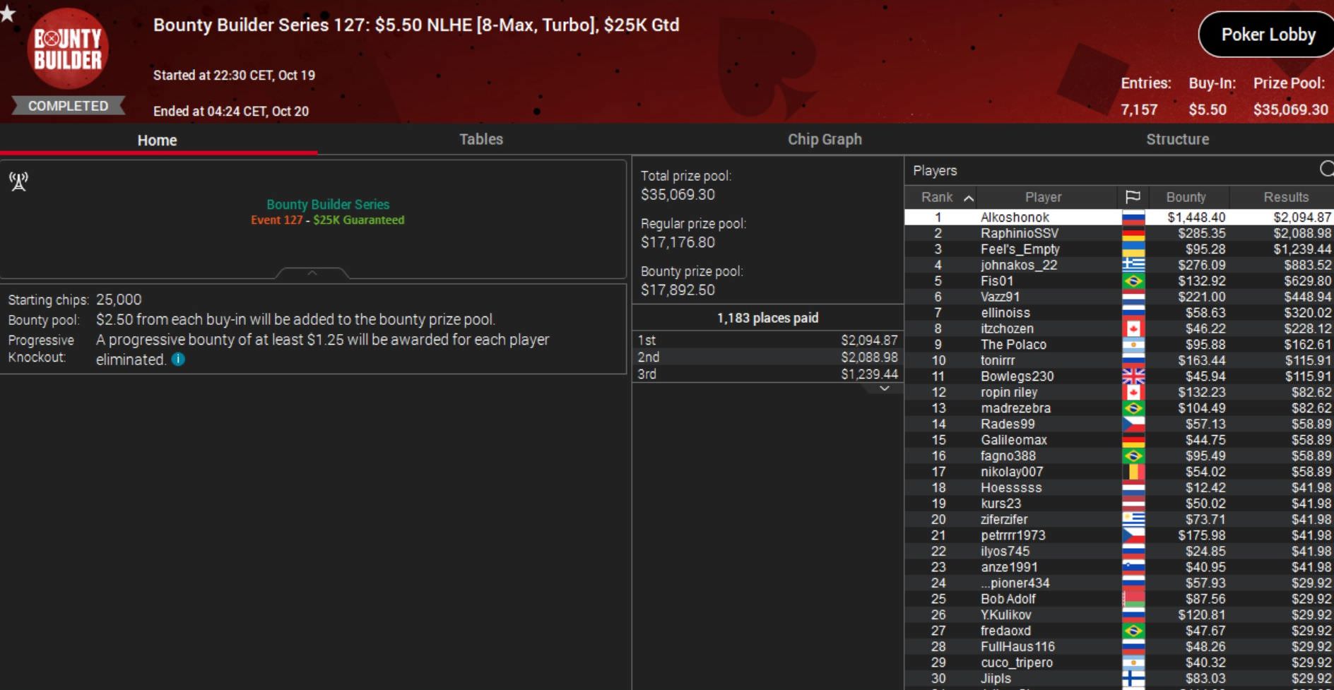 Nach den Abbrüchen diverser Turniere konnte PokerStars im Verlauf des Abends die technischen Probleme lösen und noch vier Events der Bounty Builder Series durchführen.