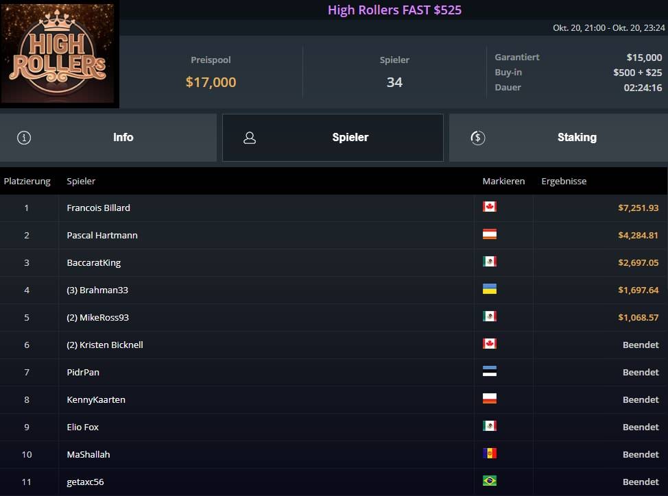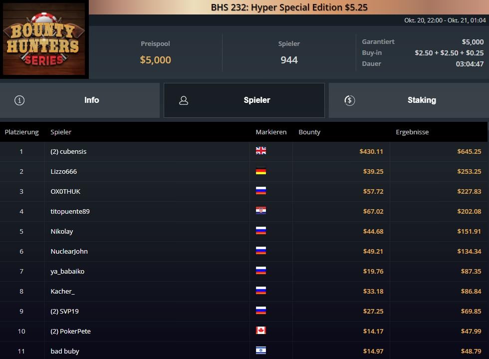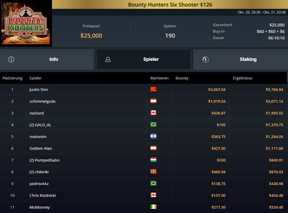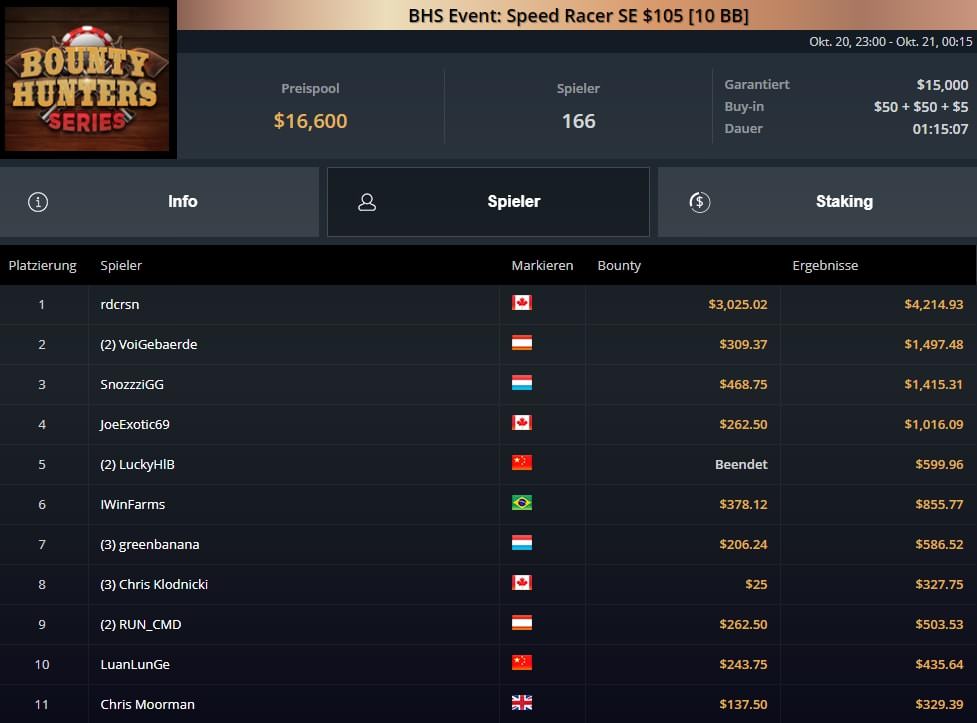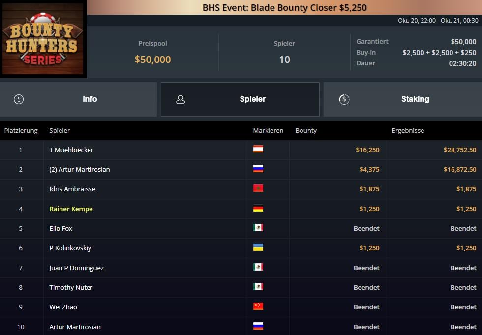 Zwar keinen Sieg aber dafür vier Plätze am Final Table gab es für die deutschsprachigen Spieler beim $3.150 Bounty King Event. Der Deutsche „granjefe“ wurde ihr Runner-Up für $21.697 (inkl. $3.750 Bounties). „Mangudai“ (AUT) belegte Platz 3 für $18.343 (inkl. $4.500 Bounties). Außerdem cashten noch Pascal Hartmann (GER/AUT – Platz 4 – $20.047 inkl. $9.375 Bounties) und Christian Rudolph (GER/AUT – Platz 6 – $8.969 inkl $2.625 Bounties).