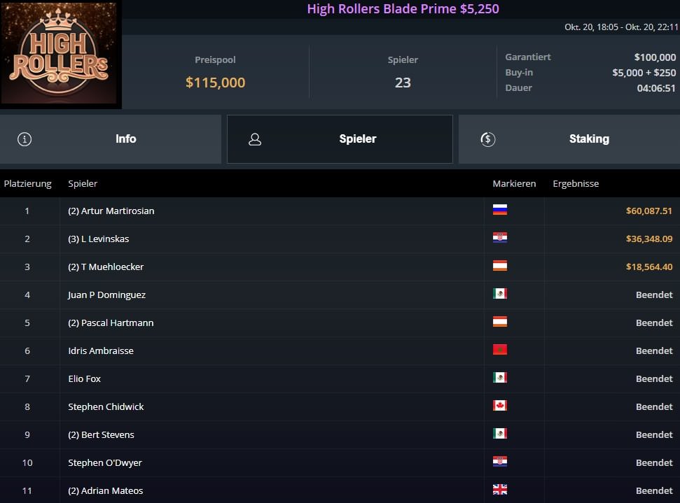 Das beste Ergebnis für die DACH-Spieler holte der Österreicher Thomas Mühlöcker mit seinem Sieg beim $5.250 BHS Side Event. Er konnte sich im Heads-Up gegen den Russen Artur Martirosian durchsetzen und $28.752 (inkl. $16.250 Bounties) gewinnen. Thomas wurde außerdem noch Dritter beim $5.250 High Rollers Blade Prime und räumte weitere $18.564 ab.