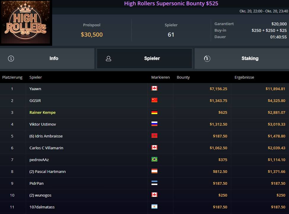 Rainer Kempe belegte beim $1.050 PLO High Roller einen guten Platz 3 für $10.144 (inkl. $5.156 Bounties). Darüber hinaus schnappte er sich noch Platz 3 für $2.881 (inkl. $625 Bounties) beim $525 High Rollers Supersonic.