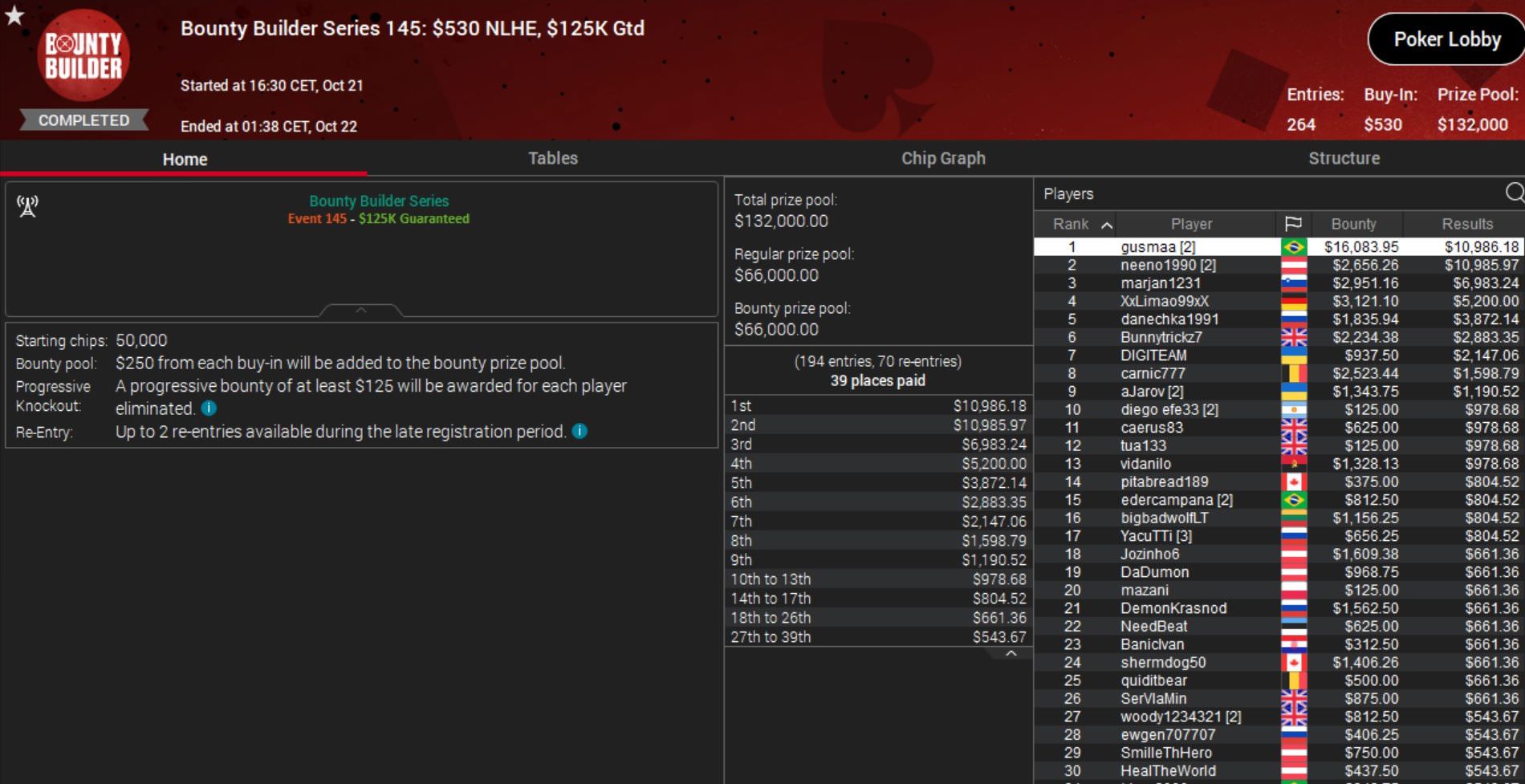 Ebenfalls knapp am Sieg vorbei schrammte „neeno1990“ bei Event 145, einem $530 NLHE. Für seinen zweiten Platz bei 264 Entrys erhielt der in Österreich lebende Spieler über $13.000 Preisgeld.