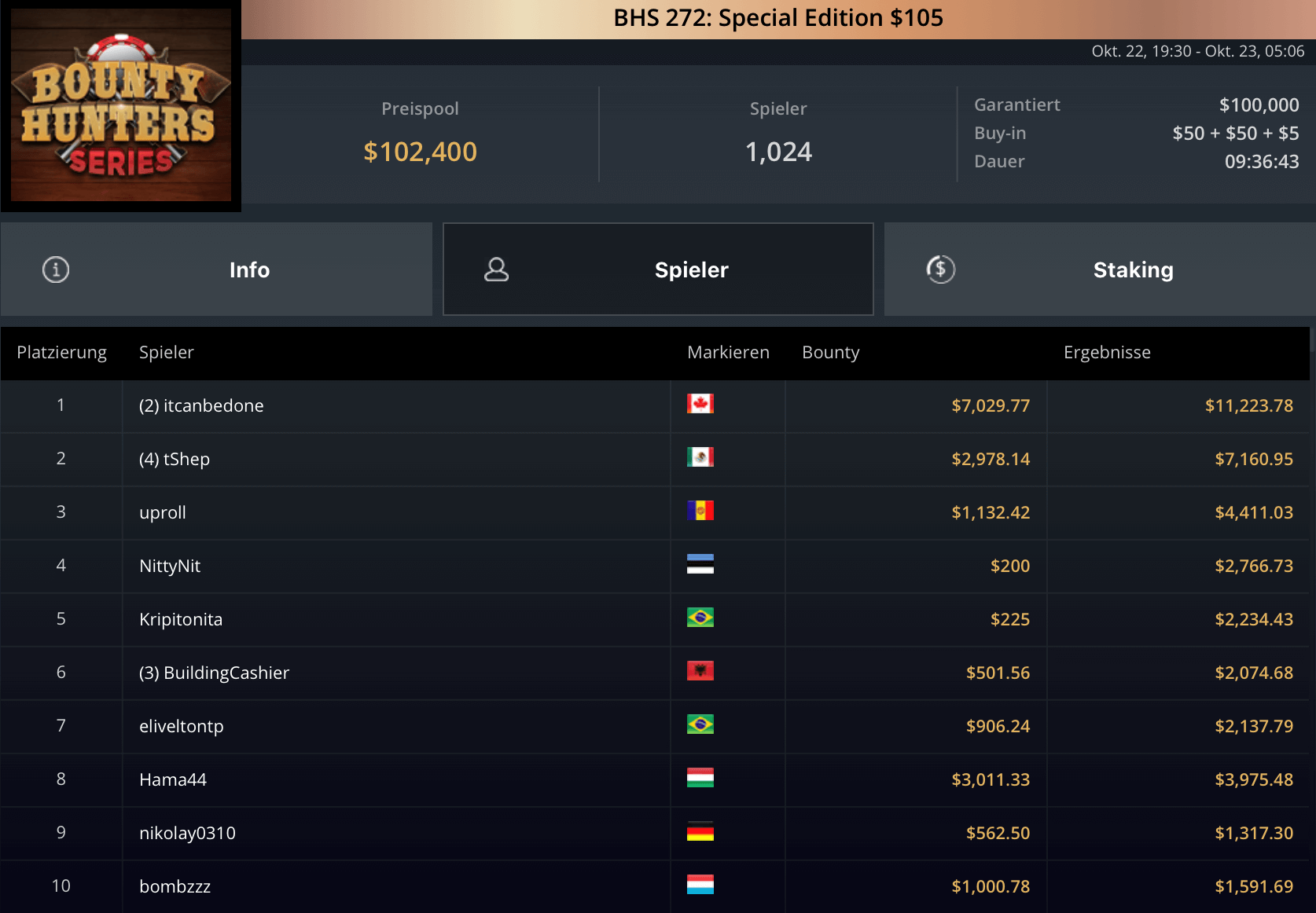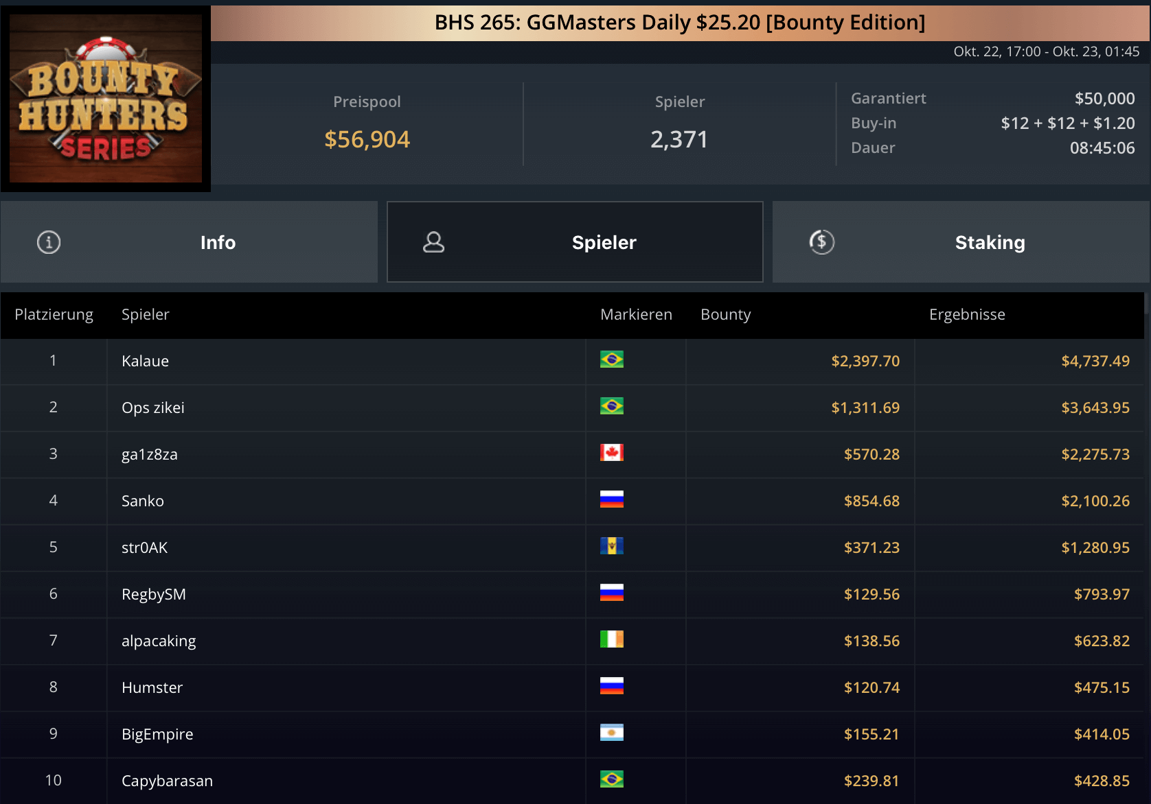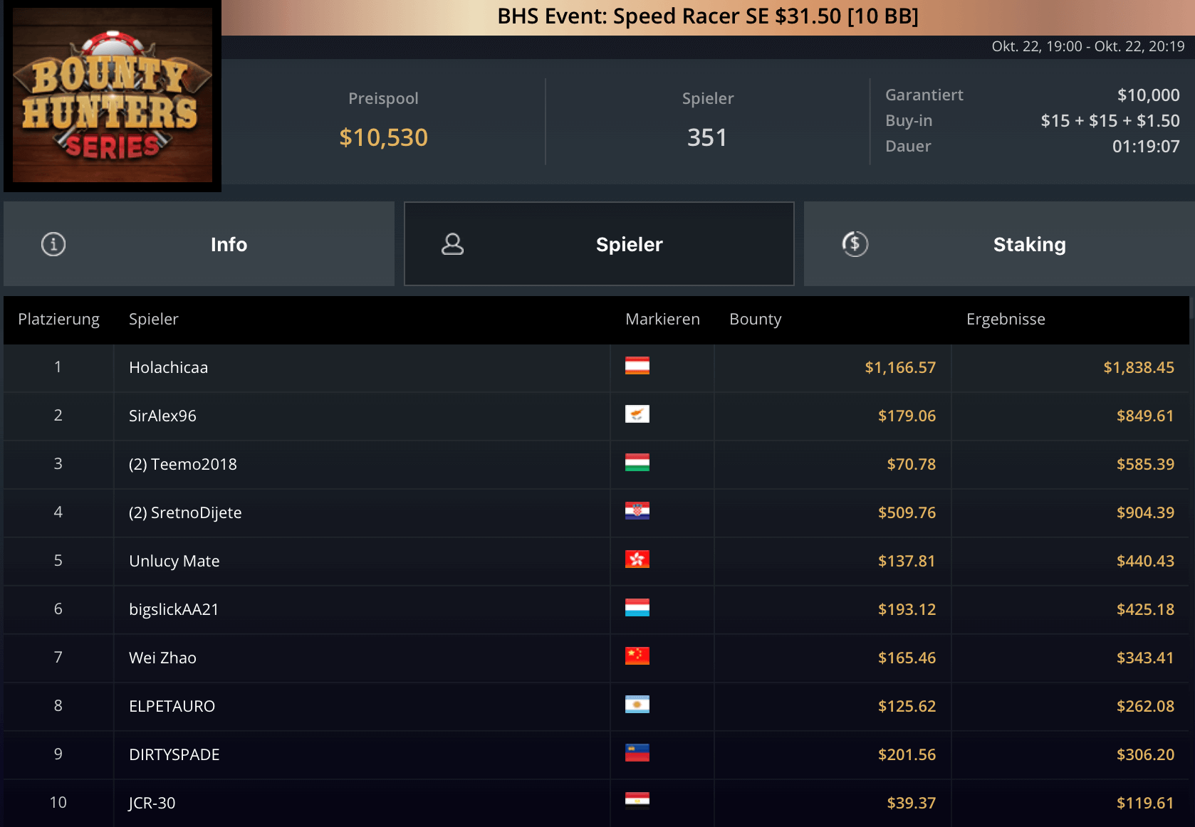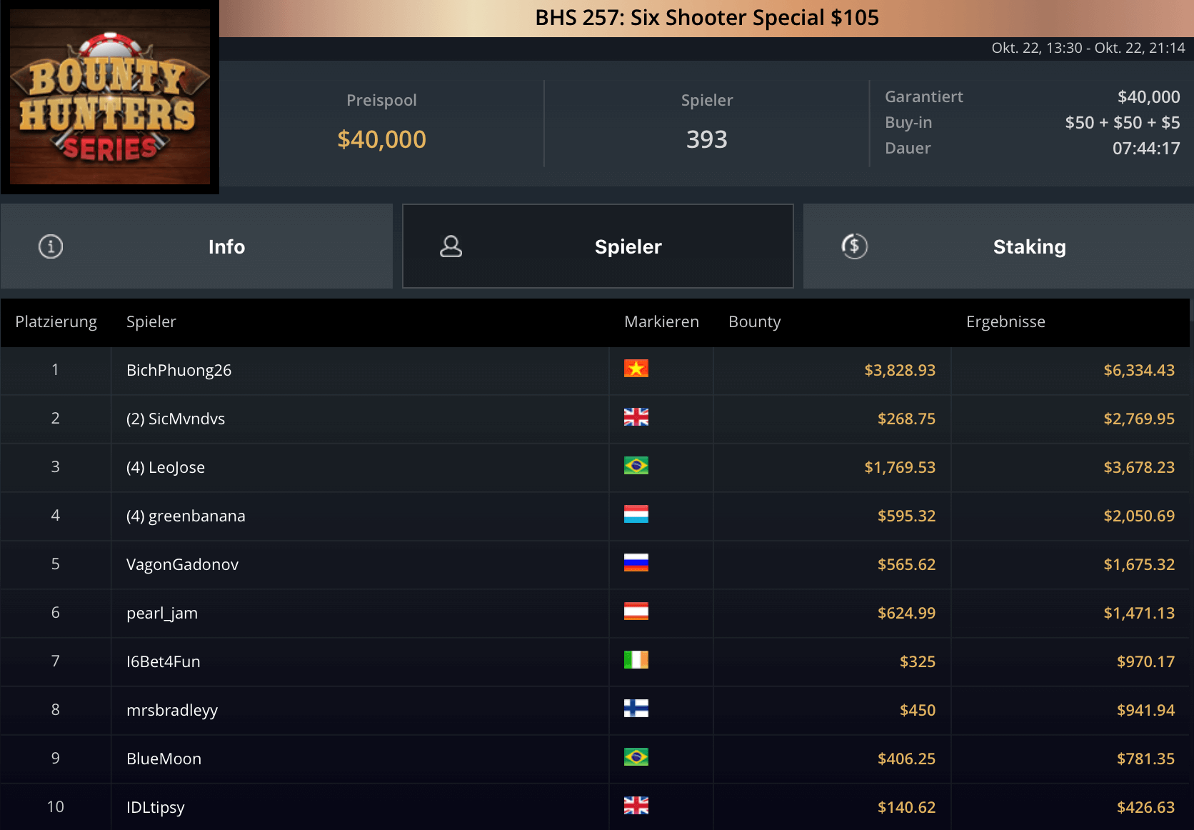 Weitere Ergebnisse der Bounty Hunter Series auf GGPoker am 22.10.2020: