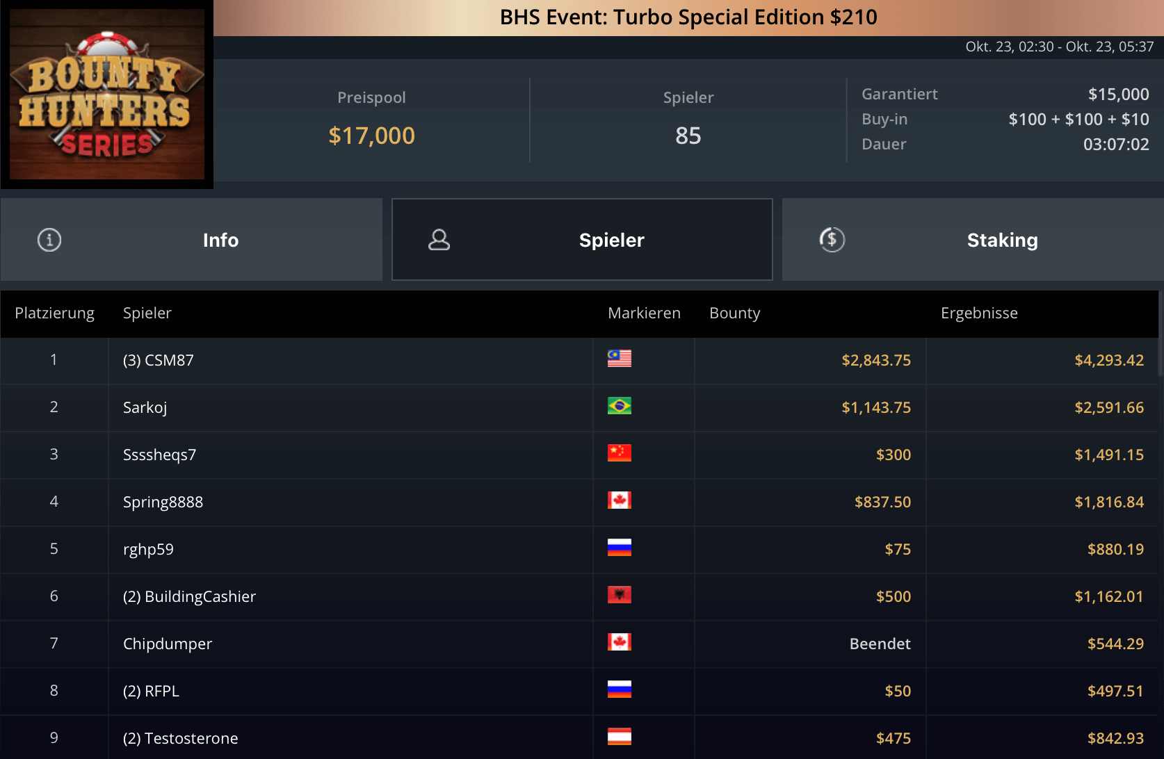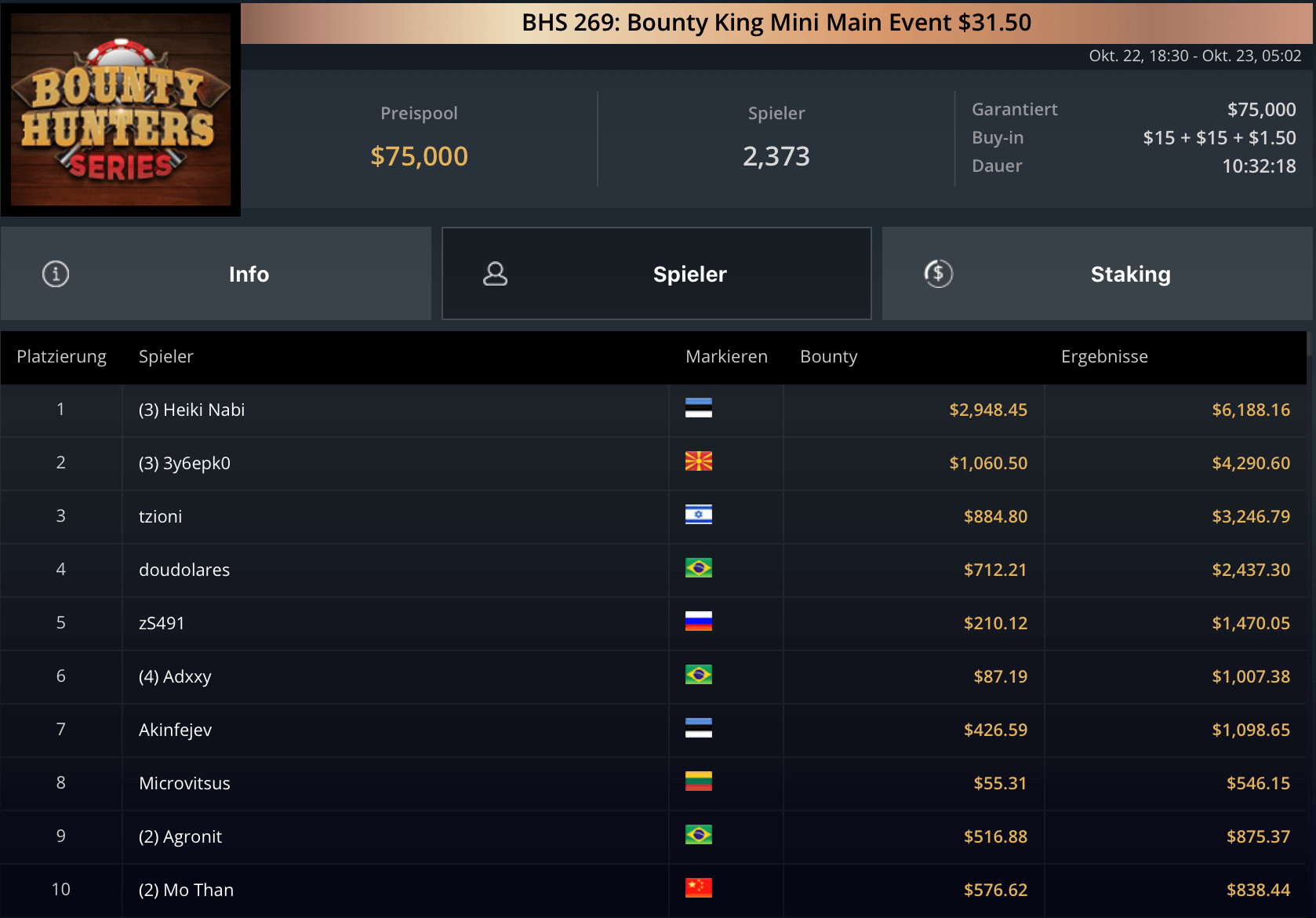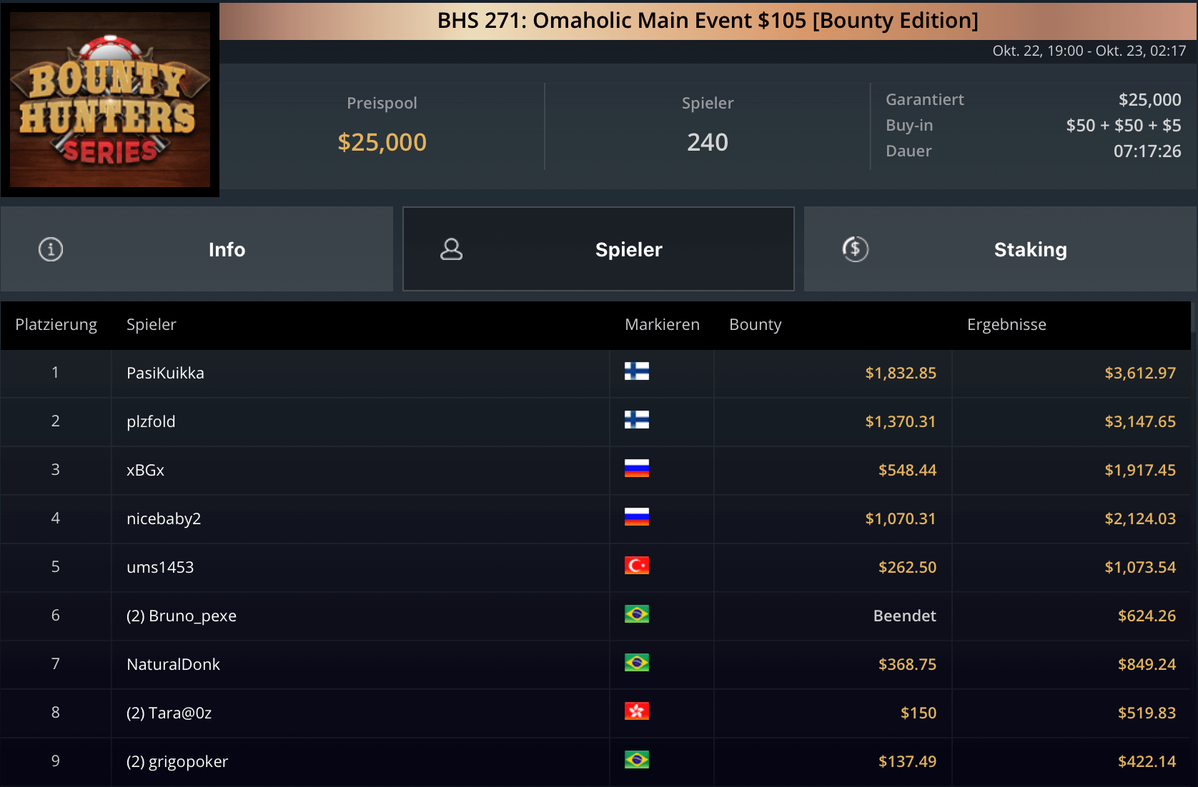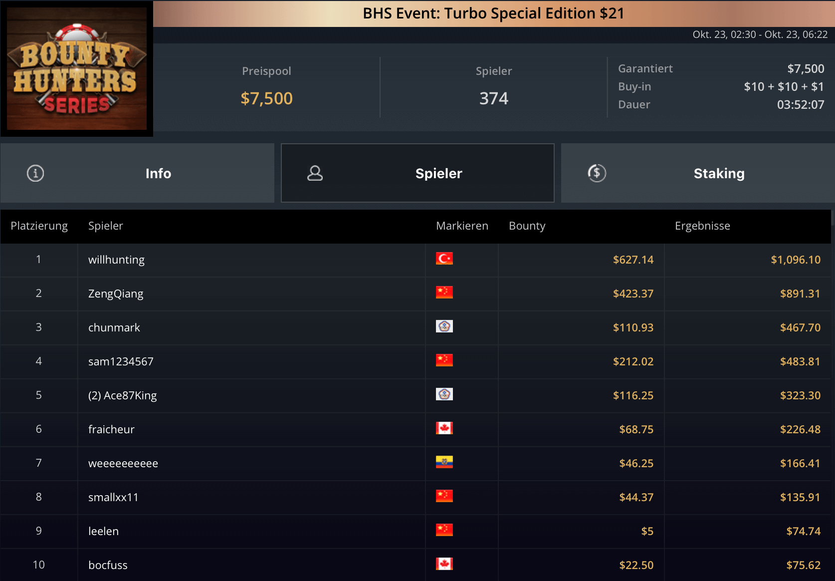 Weitere Ergebnisse der Bounty Hunter Series auf GGPoker am 22.10.2020: