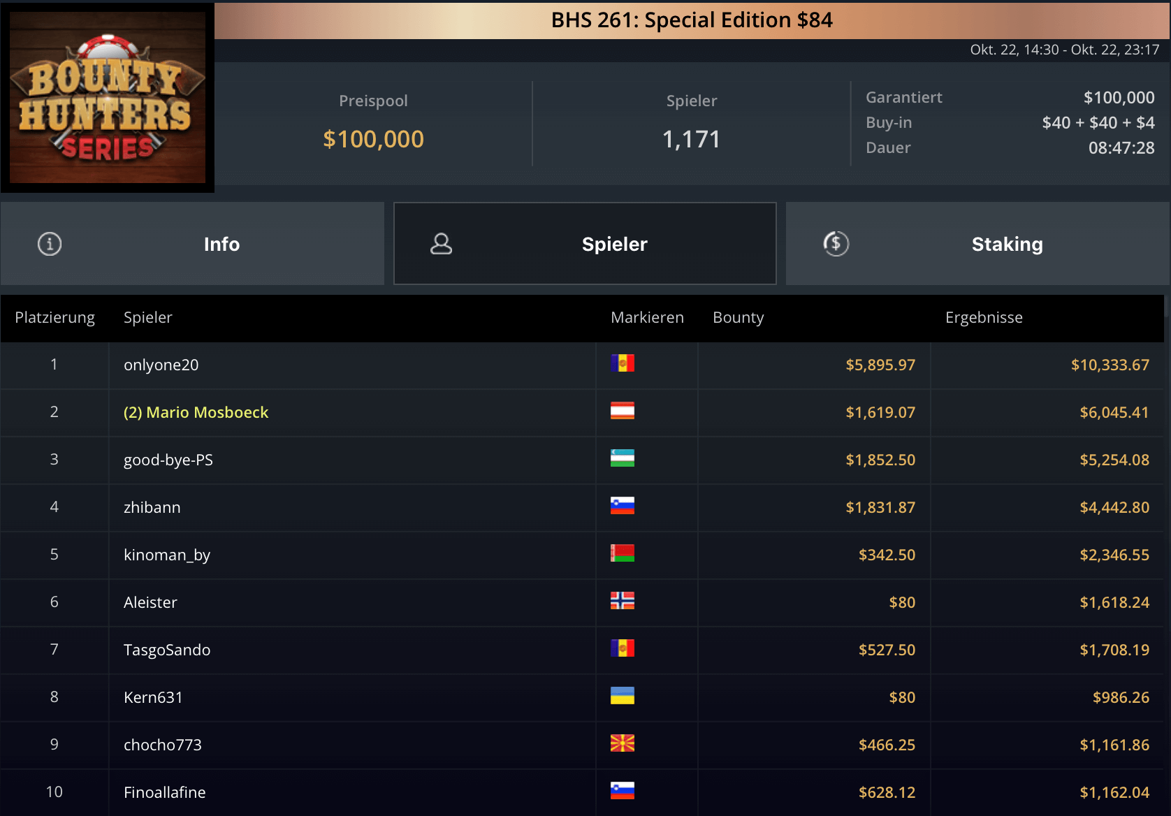 Mario Mosböck schrammte knapp an einem Bounty Hunter Series-Titel vorbei. Bei Event 261 mit $84 Buy-In kamen 1.171 Spieler zusammen, womit es um die $100.000-Garantie ging. Mösbock verlor im Heads-Up gegen „onlyone20“, der für seinen Sieg $10.333 cashen konnte. Mösbock gewann $6.045.