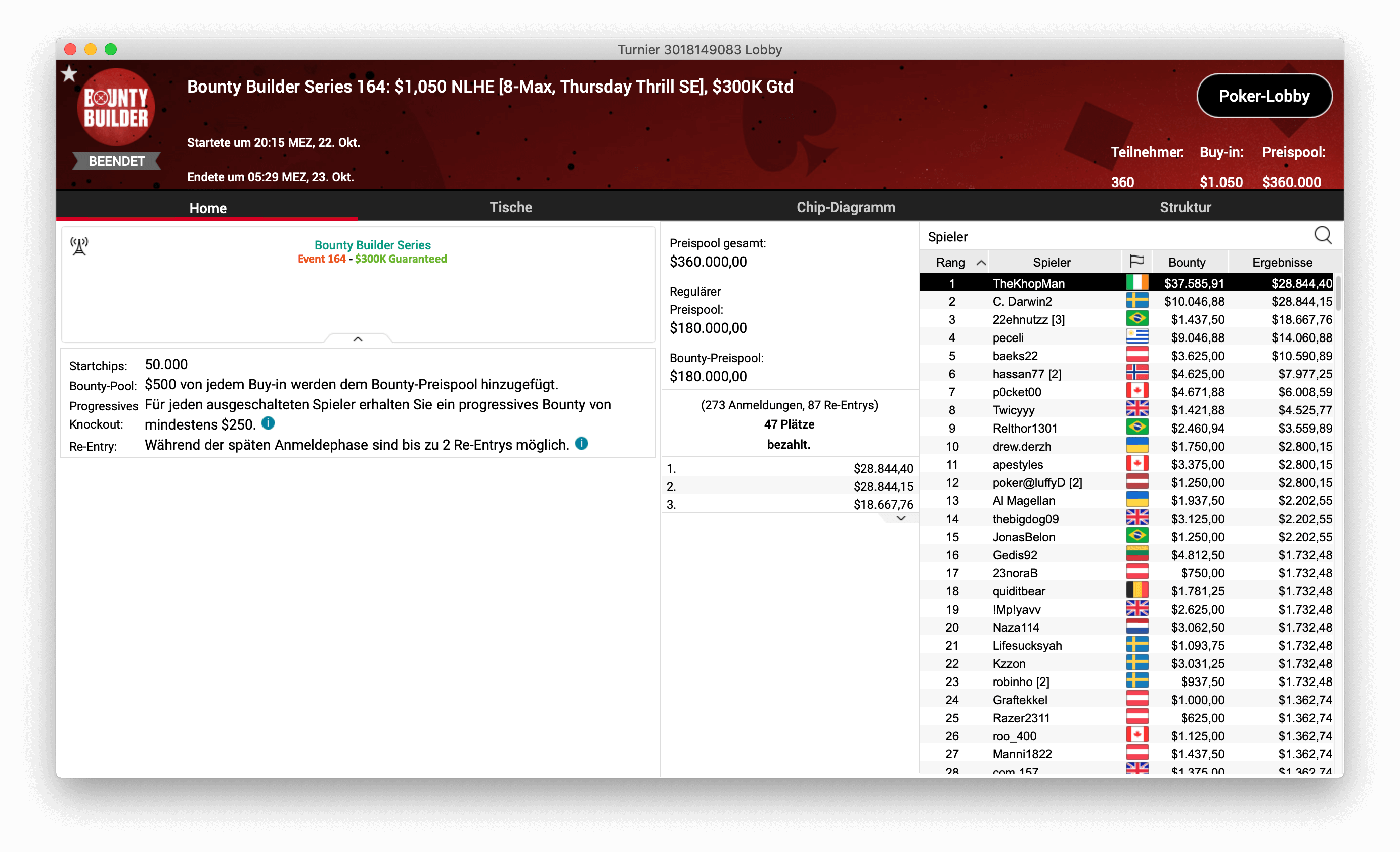 Simon Mattsson ist auf PokerStars als „C. Darwin2“ schon seit Jahren erfolgreich. Bei Event 164, einem 8-Max mit $1.050 Buy-In, verpasste er den Sieg knapp. 360 Entries von 273 Spielern sorgten für einen $360.000-Preispool. Den Sieg holte sich „TheKhopMan“ für insgesamt mehr als $66k. Er besiegte Mattsson im Heads-Up, der als Runner-Up knapp $39k einsackte. Auf Platz 5 konnte sich Stefan Schillhabel als „baeks22“ platzieren für $14k.