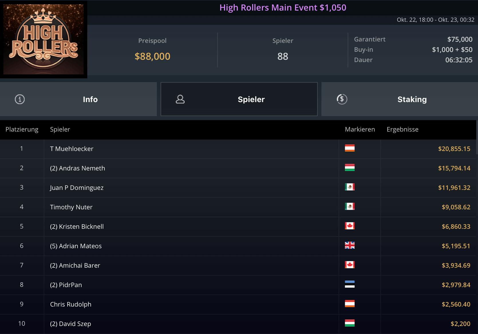 Das High Rollers Main Event mit $1.050 Buy-In hatte mit 88 Spielern einen $88.000 großen Preispool. Den Sieg schnappte sich Thomas Mühlöcker vor Andras Nemeth. Mühlöcker durfte sich über $20.855 freuen. Nemeth gewann auf Platz 2 $15.794.