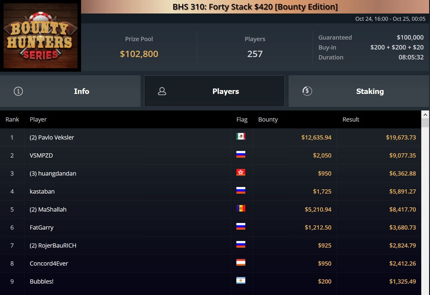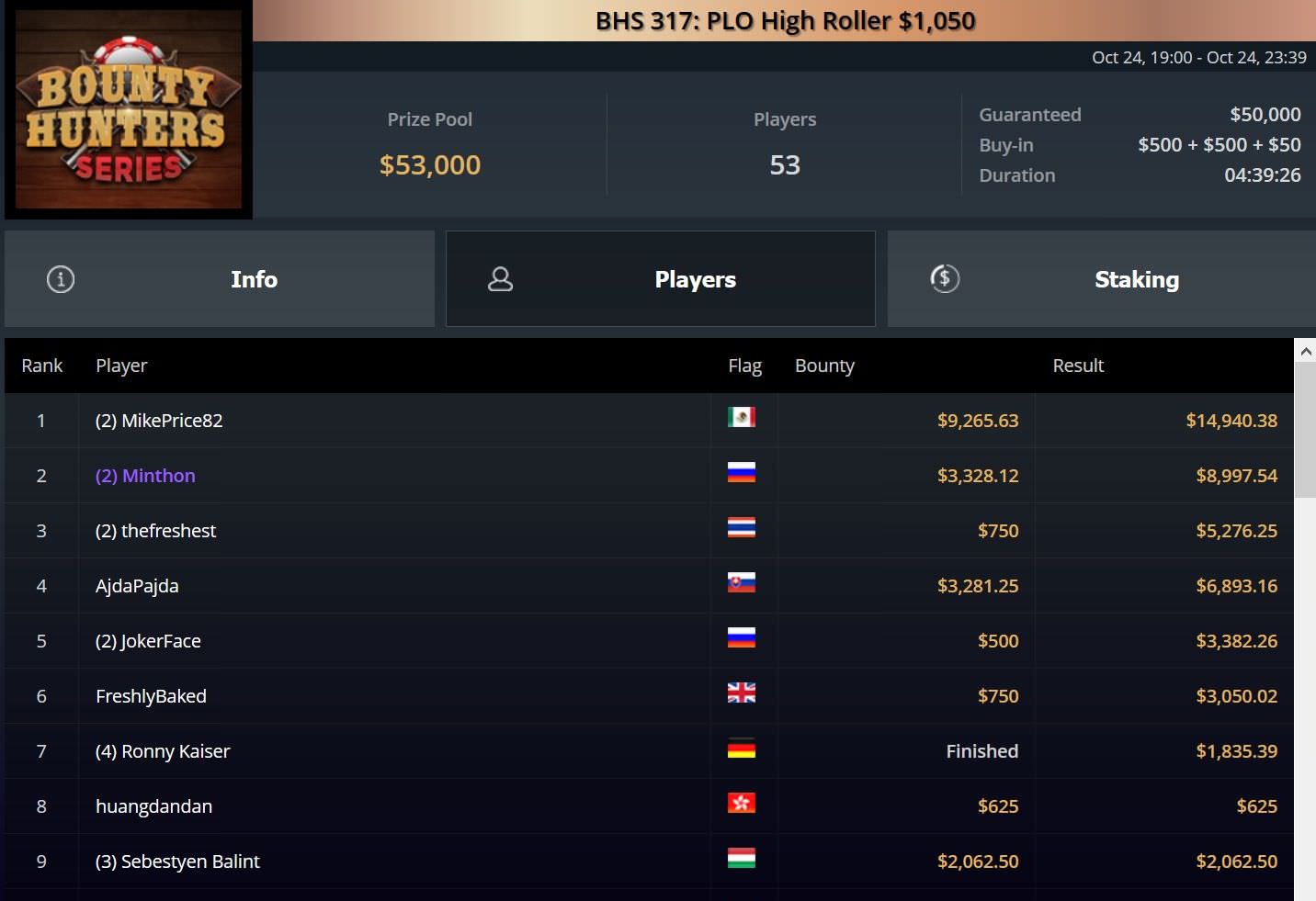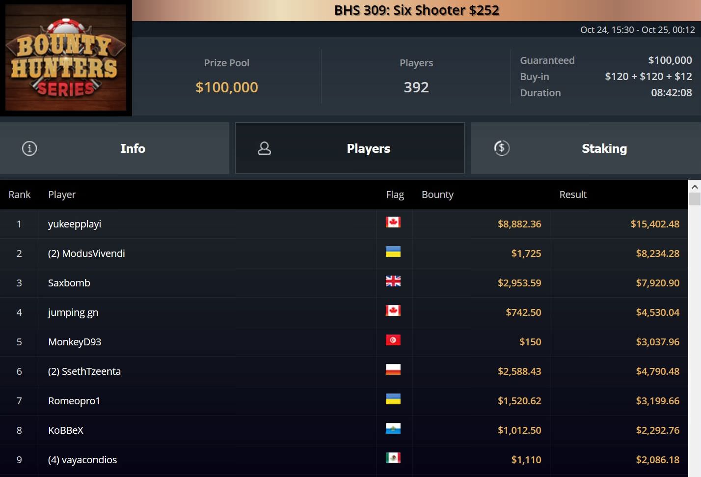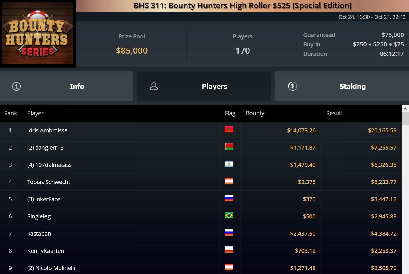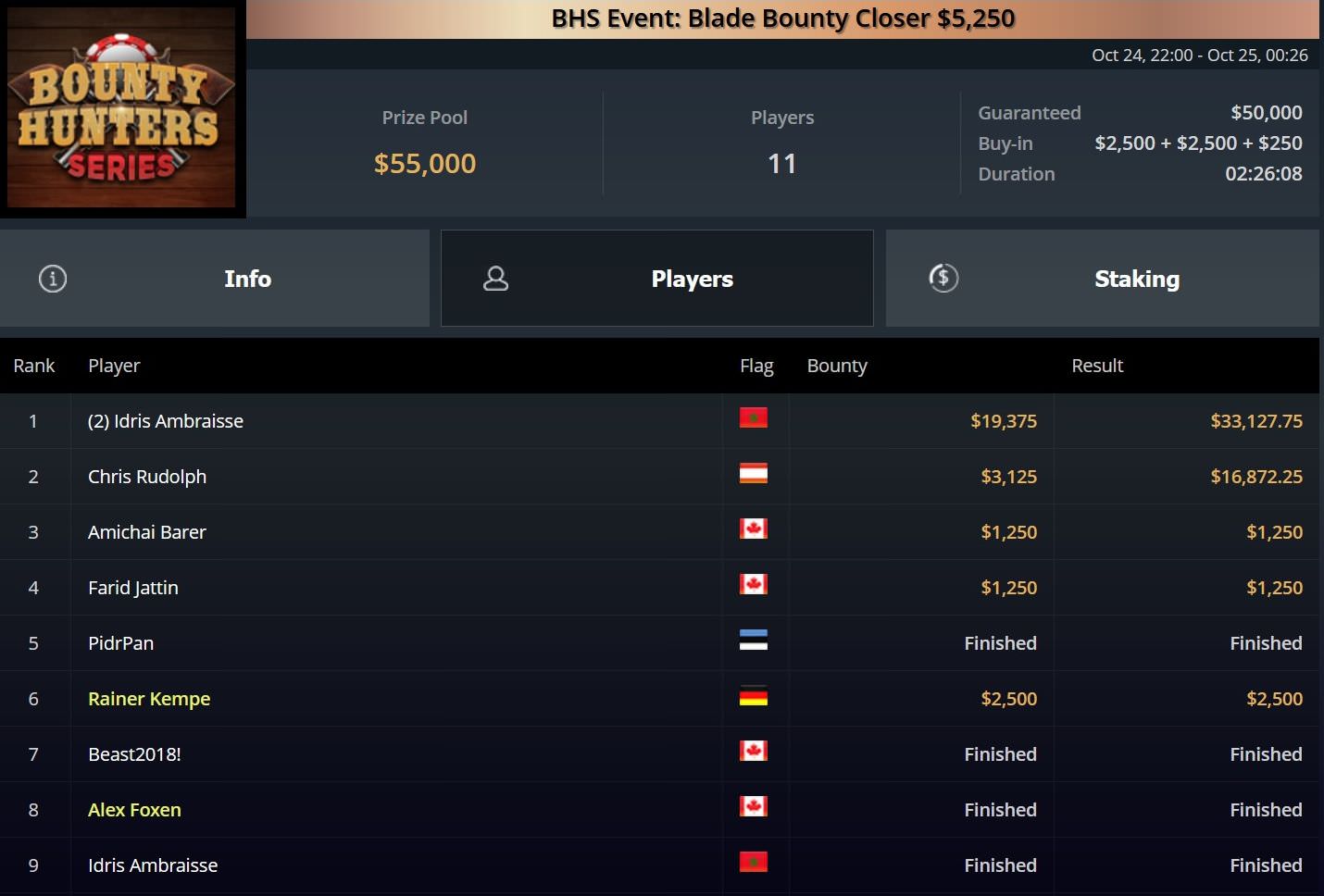 Für Platz 2 erhielt Rudolph knapp $17.000, während Ambraisse gut $33.000 erhielt und weitere $20.000 beim BHS Event 311 absahnte.