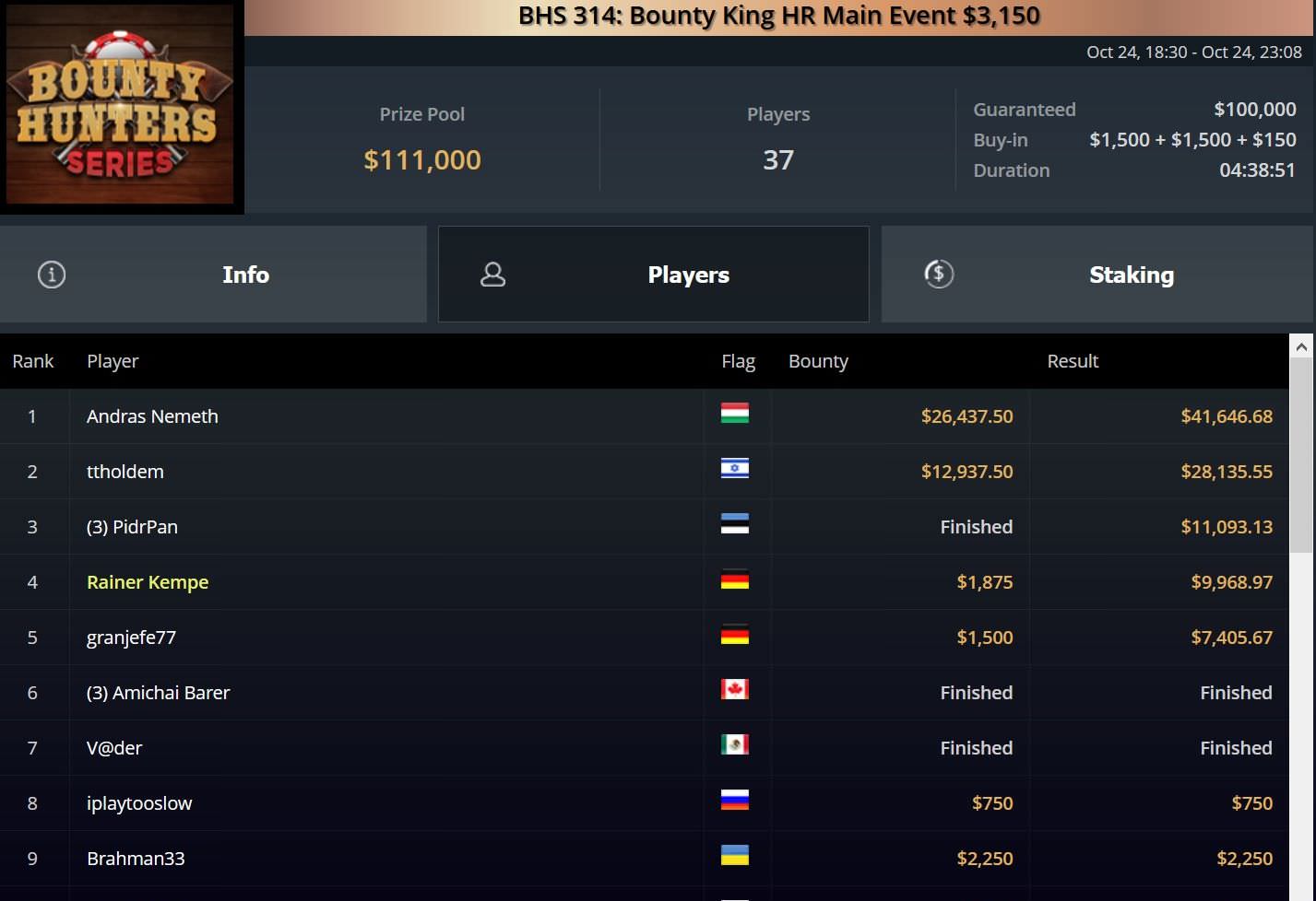 Während sich Rainer Kempe beim $5.250 Blade Bounty Closer noch mit Bountys im Wert von $2.500 begnügen musste, das Preisgeld aber verpasste, lief es bei BHS Event 314, dem $3.150 Bounty King HR Main Event, besser für den SHRB-Sieger von 2016.
