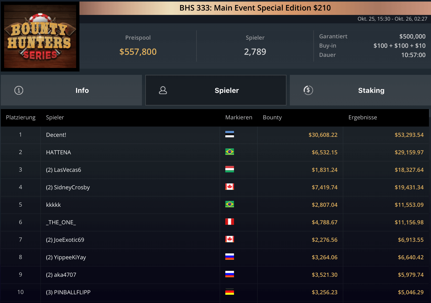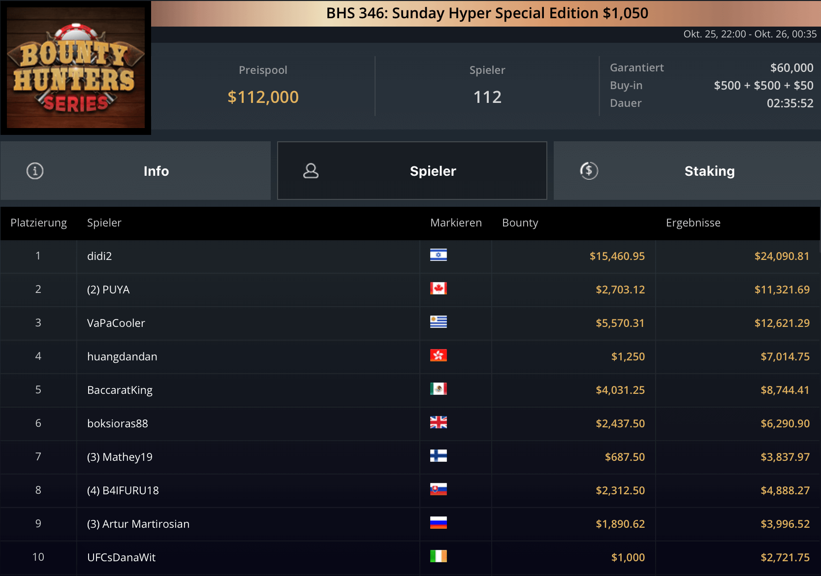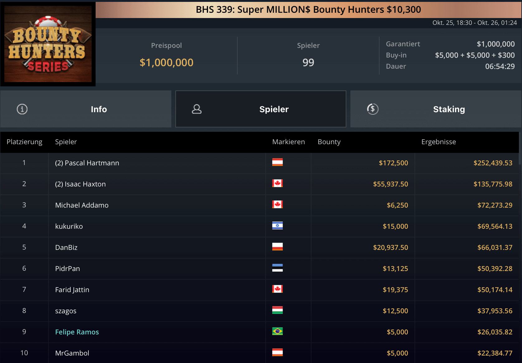 Er gewann das $10.300 Super MILLION$ Bounty Hunters für sagenhafte $252.439. 99 Spieler bezahlten das große Buy-In, viel Prominenz war mit dabei. Runner-Up wurde Isaac „Ike“ Haxton für mehr als $135.000, Michael Addamo gewann auf dem dritten Platz mehr als $72.000.
