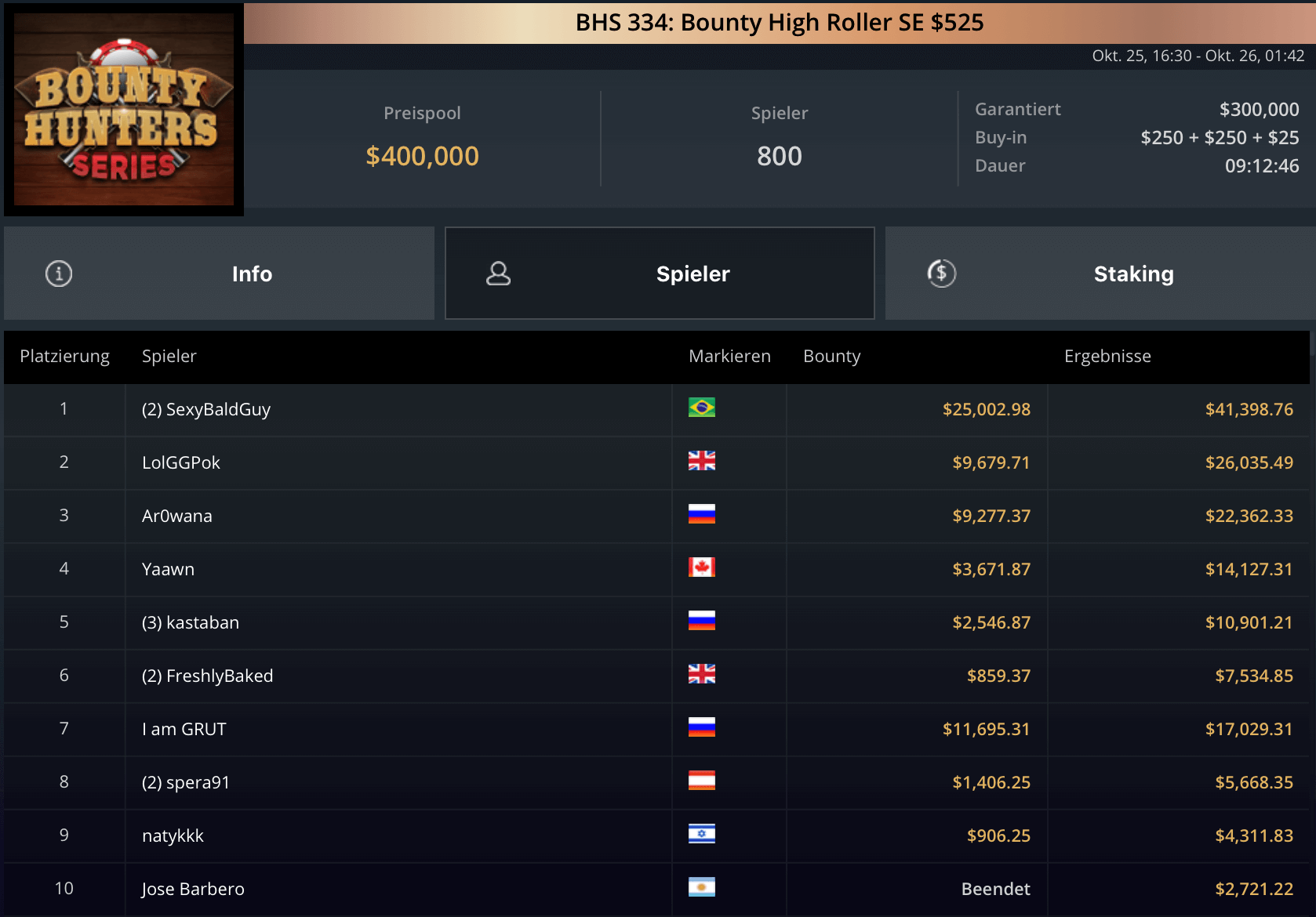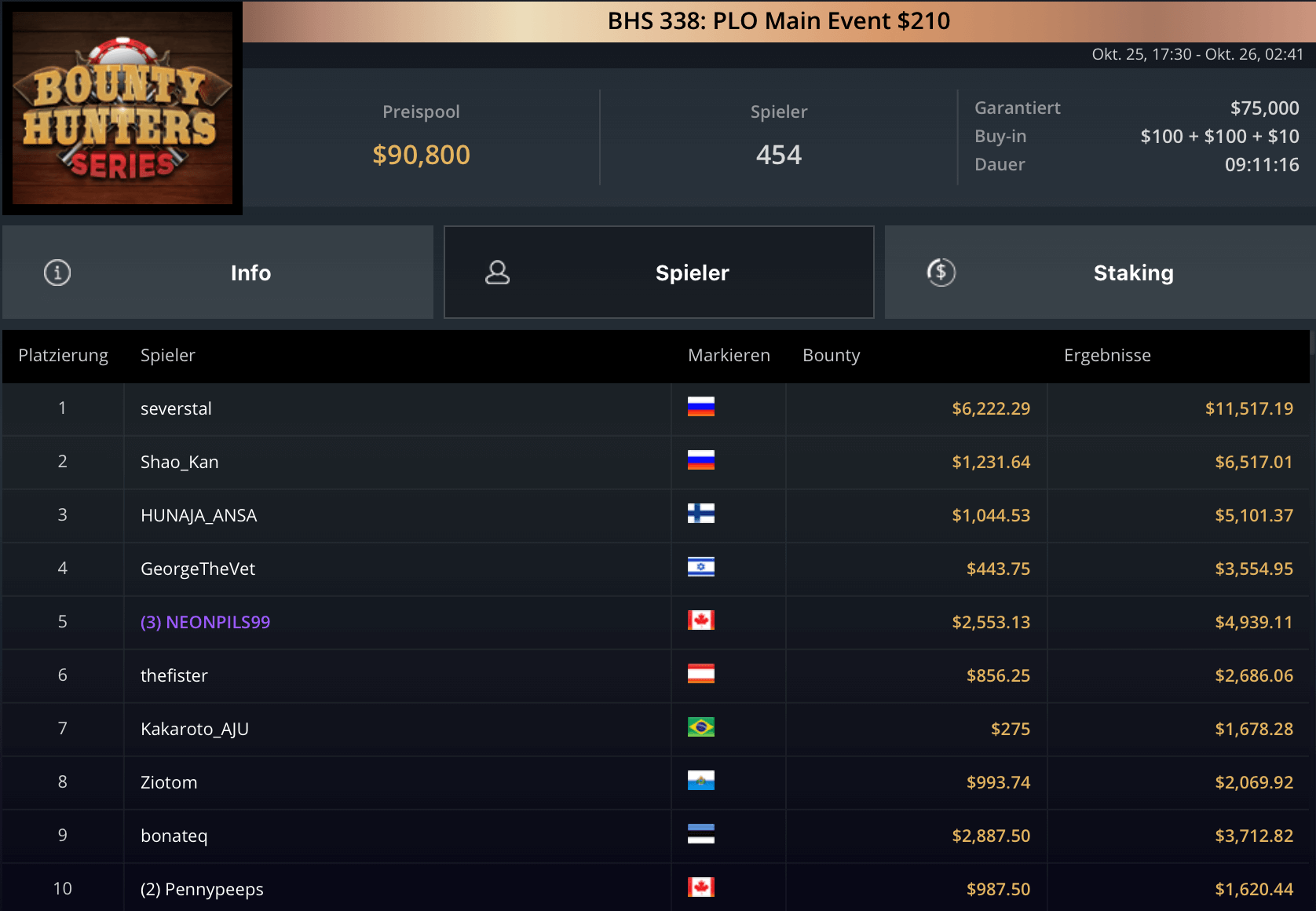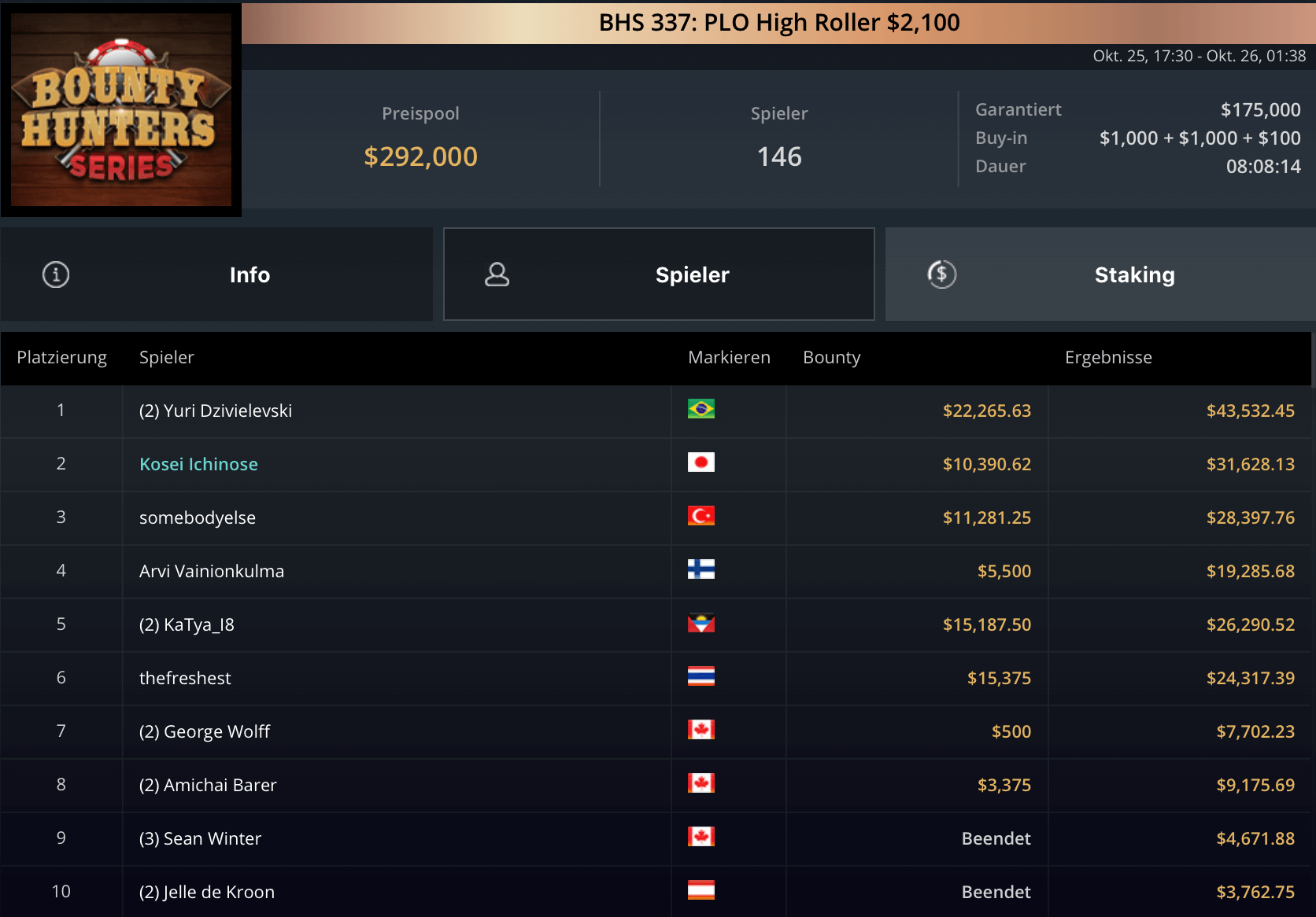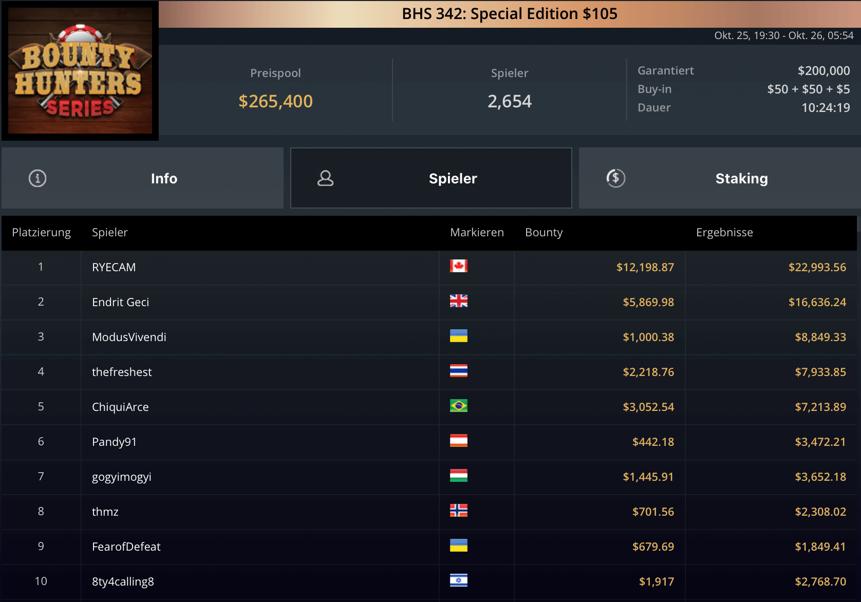 Er gewann das $10.300 Super MILLION$ Bounty Hunters für sagenhafte $252.439. 99 Spieler bezahlten das große Buy-In, viel Prominenz war mit dabei. Runner-Up wurde Isaac „Ike“ Haxton für mehr als $135.000, Michael Addamo gewann auf dem dritten Platz mehr als $72.000.