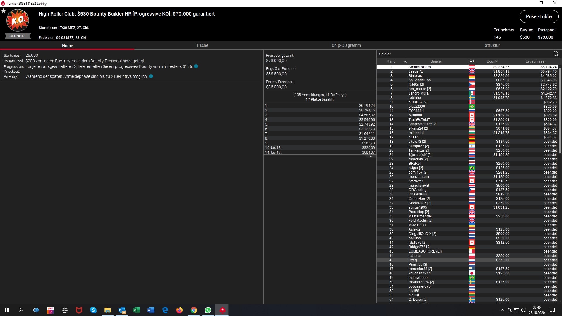 Den größten Preispool am Dienstag im High Roller Club, gab es beim $530 Bounty Builder High Roller. Hier bauten 146 Entries einen Preispool von $73.000 auf. Am Ende durfte sich der Österreicher „SmilleThHero“ über den Titel und $6.794 + $9.234 Bounties freuen. Der deutsche „Sintoras“ belegte noch Platz 3 für $4.585 + $3.226 Bounties.