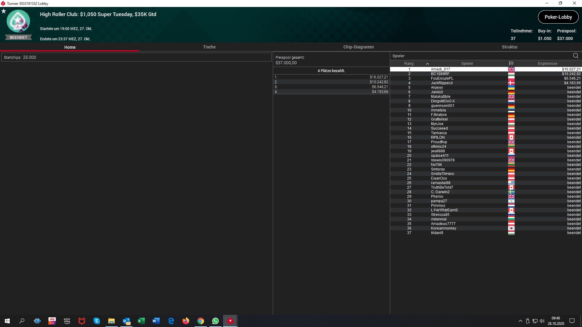 Einen weiteren Sieg für unsere Jungs gab es beim $215 Fat Tuesday. Hier gab es einen Heads-Up Deal und der Deutsche „kackvogel84“ durfte sich über den offiziellen Sieg und $4.069 freuen. Ebenfalls an den Final Table schafften es, „ToBzn92“ (GER – Platz 4 – $1.962) und „S’KCEBtm“ (GER – Platz 8 – $654).