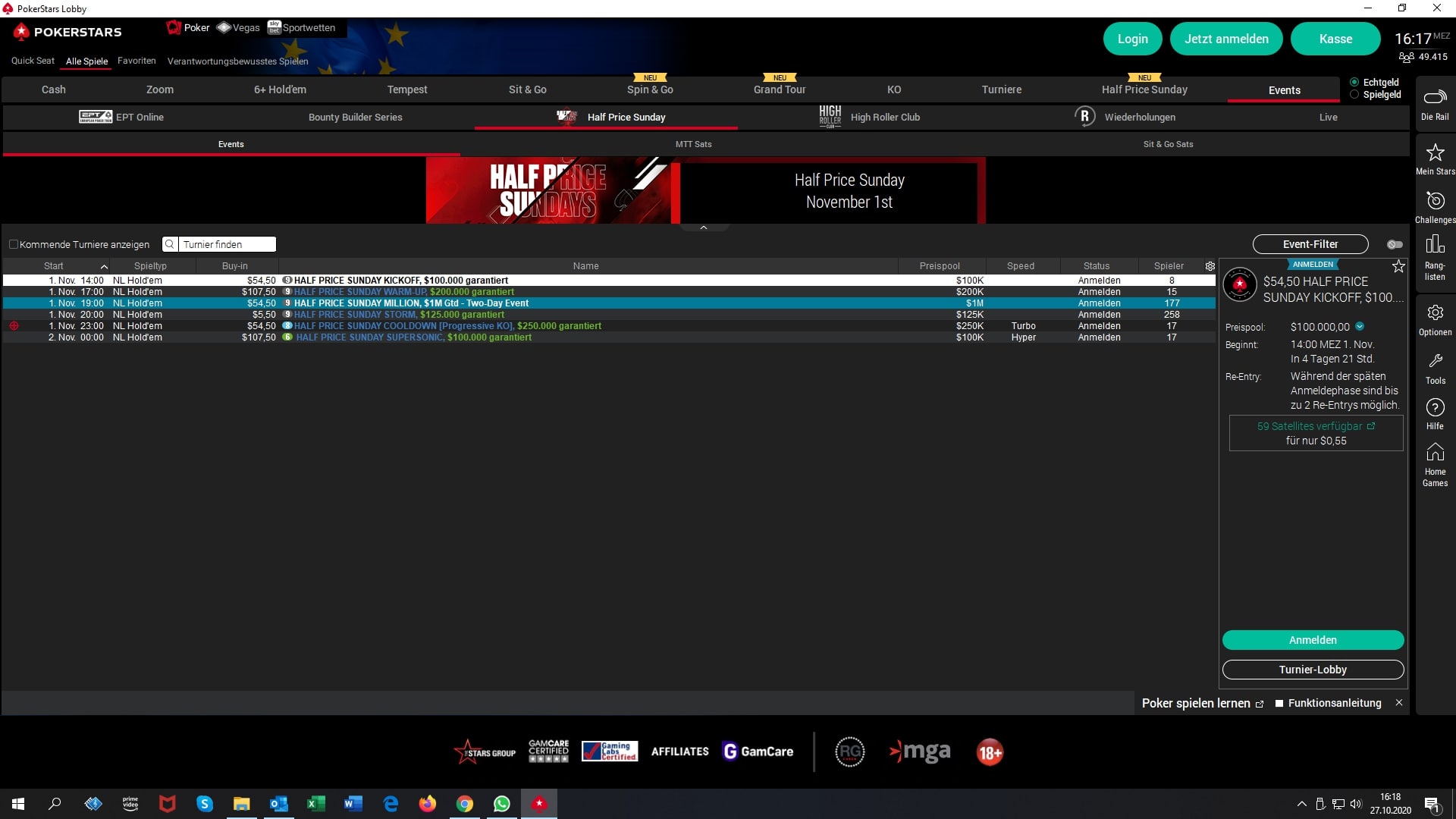 Dann werden noch das $54,50 Half Price Sunday Cooldown mit $250.000 GTD und das $107,50 Half Prize Sunday Supersonic mit $100.000 GTD angeboten.