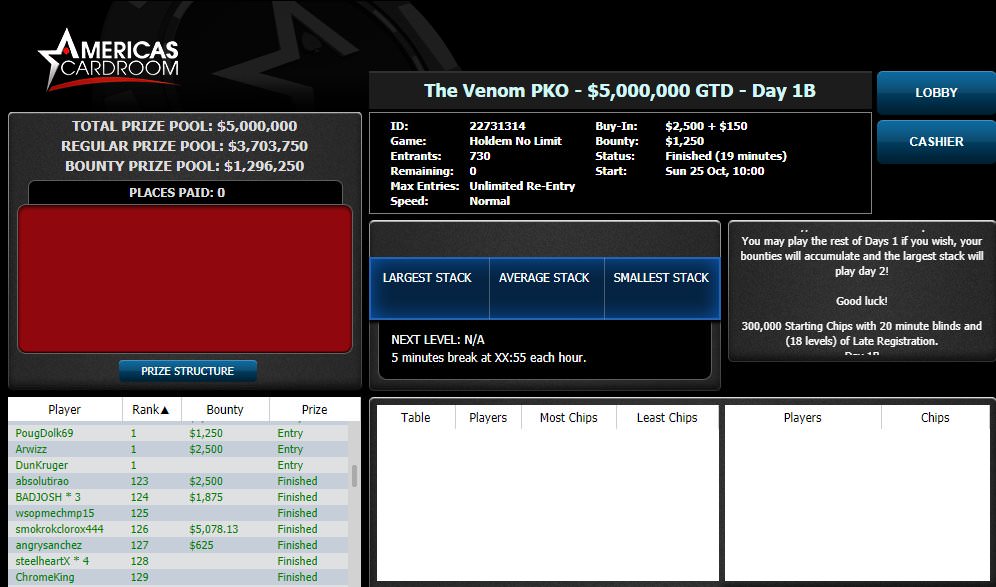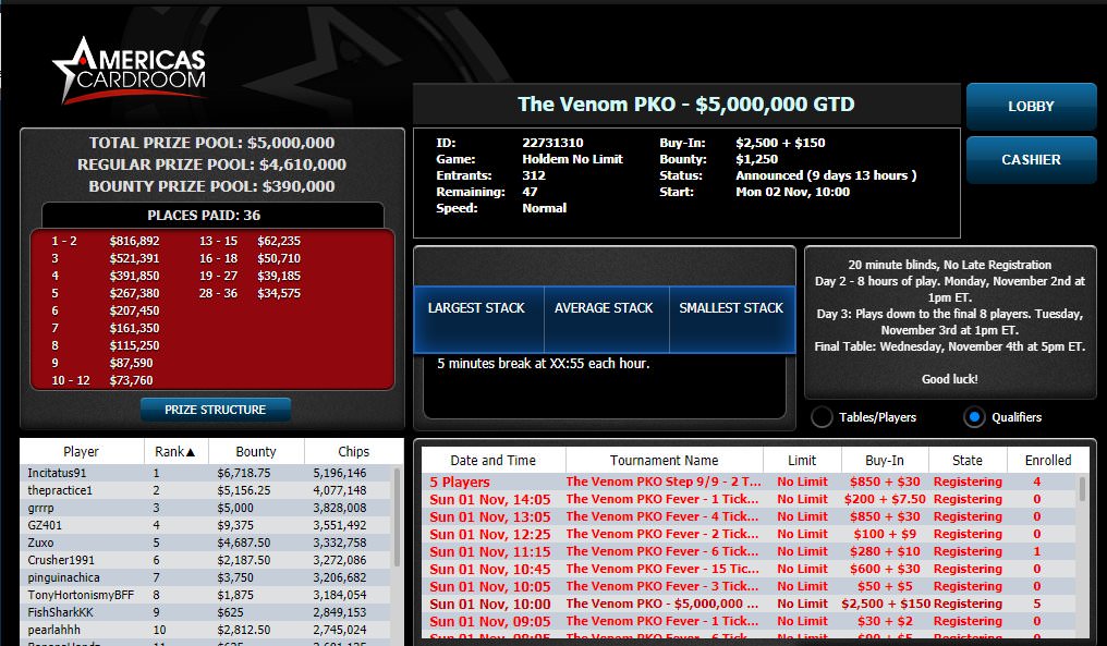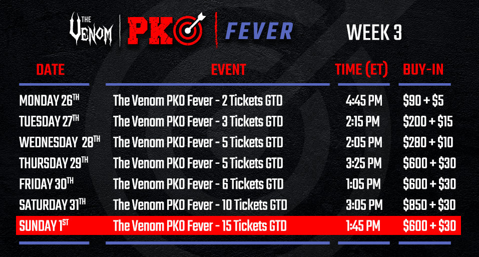 Das Venom PKO Main Event ist der Höhepunkt des ACR Venom PKO Fever Festivals, welches vom 13. Oktober bis 01. November gespielt wird. Mit einer Garantiesumme von $5.000.000 ist es das höchstdotierte Progressive Knockout Online Event überhaupt. Es gibt PKO Bounties von $1.250 pro Spieler. Allein $1.000.000 sind für den Champion reserviert. Die Turnier-Struktur ist besonders langsam, so dass es neben den vier Starttagen Eins noch drei weitere Spieltage dauert bevor der Sieger feststeht. Die Startdotation beträgt 300.000 und jeder Level dauert 20 Minuten.