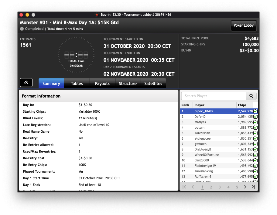 Die Monster Main Events laufen noch: Dort lief am Samstag Tag 1 auf partypoker. Late-Reg ging nur bis ins zehnte Level. Das Monster #1 Mini für $3,30 sammelte bei $15.000 garantiertem Preispool nur $4.683 ein, das große $33 Turnier bei $150.000 GTD nur $34.170. Auch hier gab es massiv free Value on top für die Spieler! Heute um 20:30 Uhr geht es weiter.