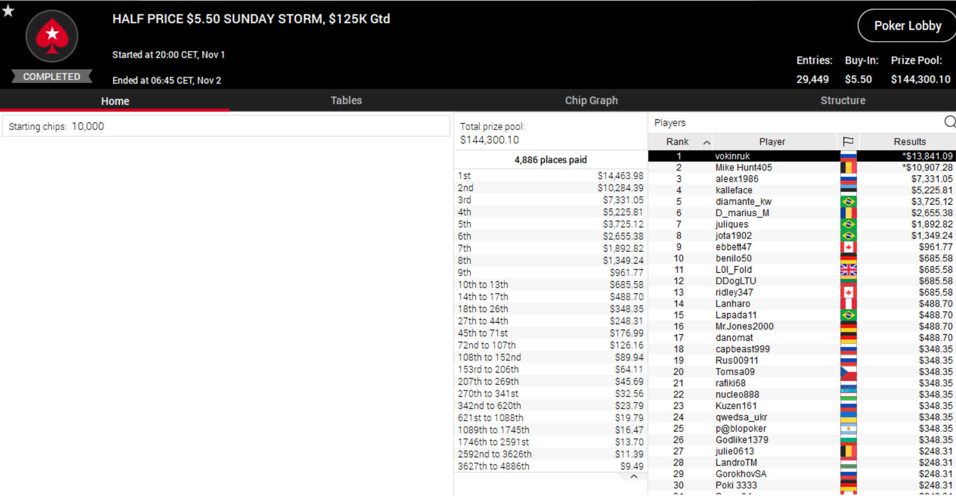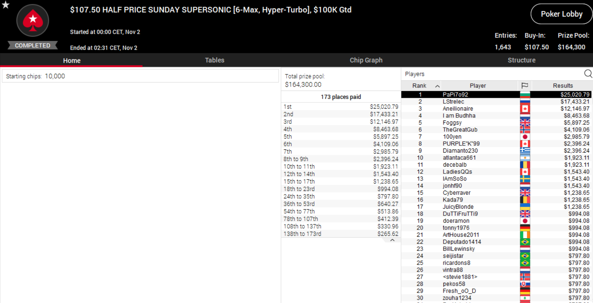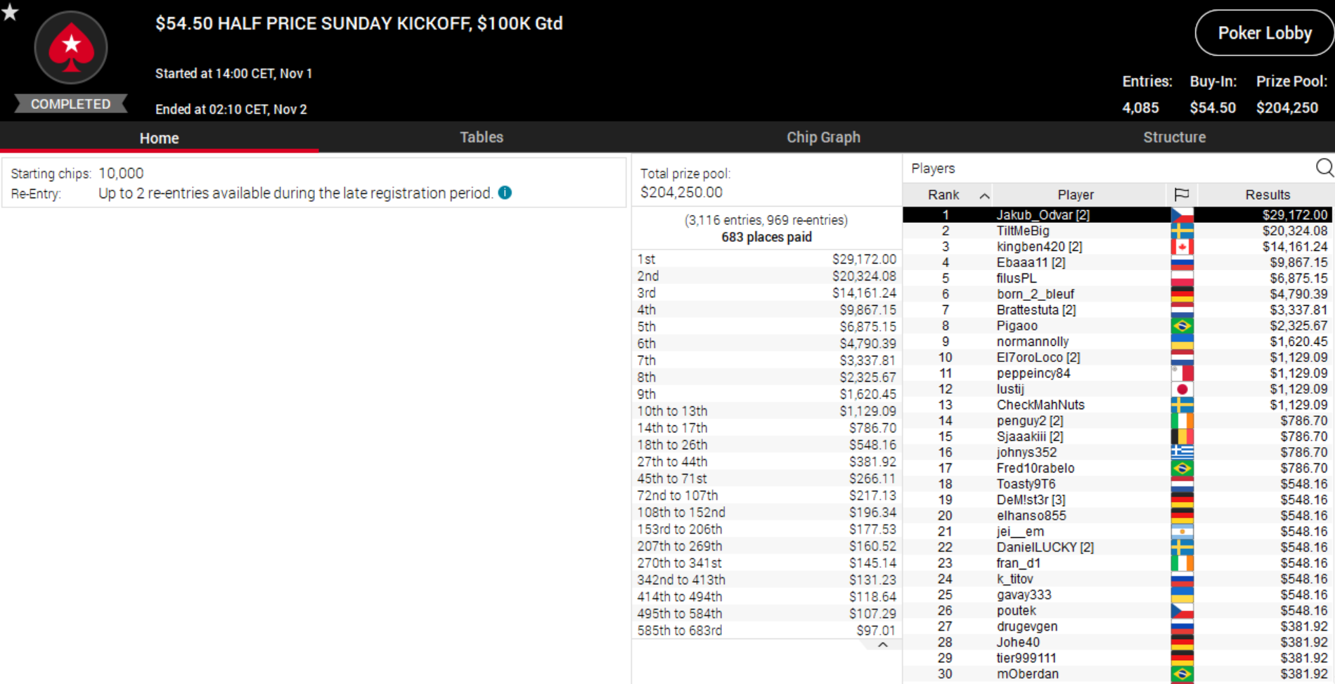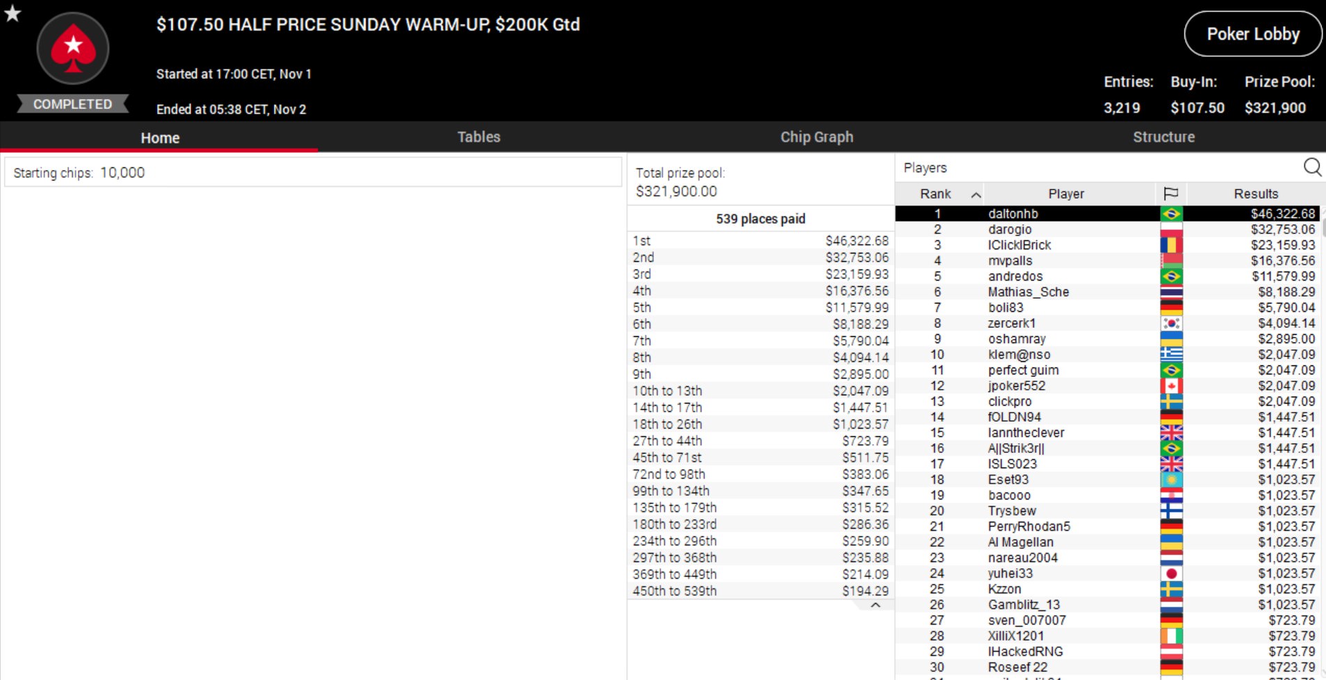 Siebter wurde derweil „boli83“ beim $107,50 Half Price Sunday Warm-Up, was ihm knapp $5.800 einbrachte.