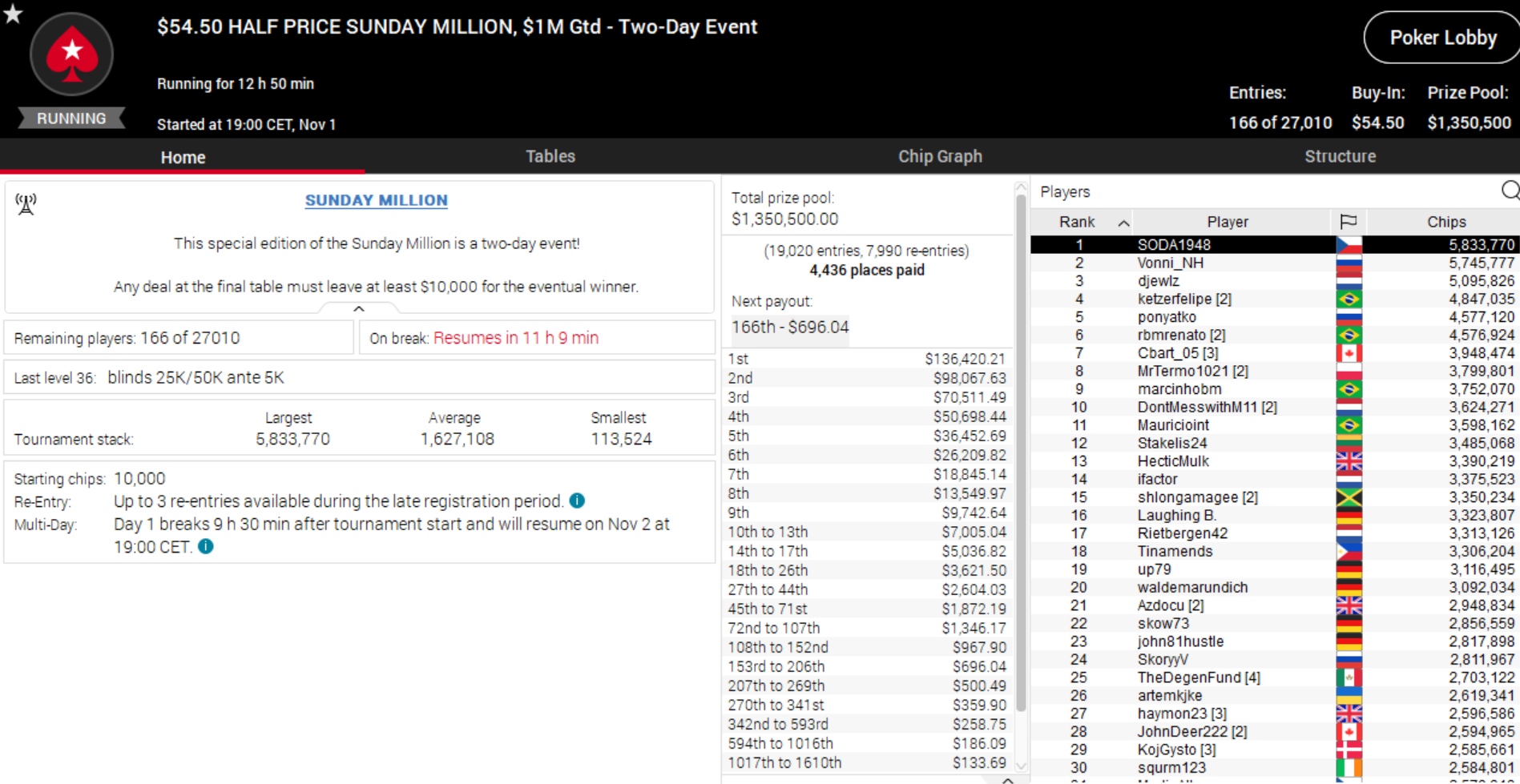 Allein bei der $54,50 Half Price Sunday Million kauften sich 27.010 Entrys ein und sorgten so für eine klar geknackte Garantie mit einem Preisgeld von $1.350.500.