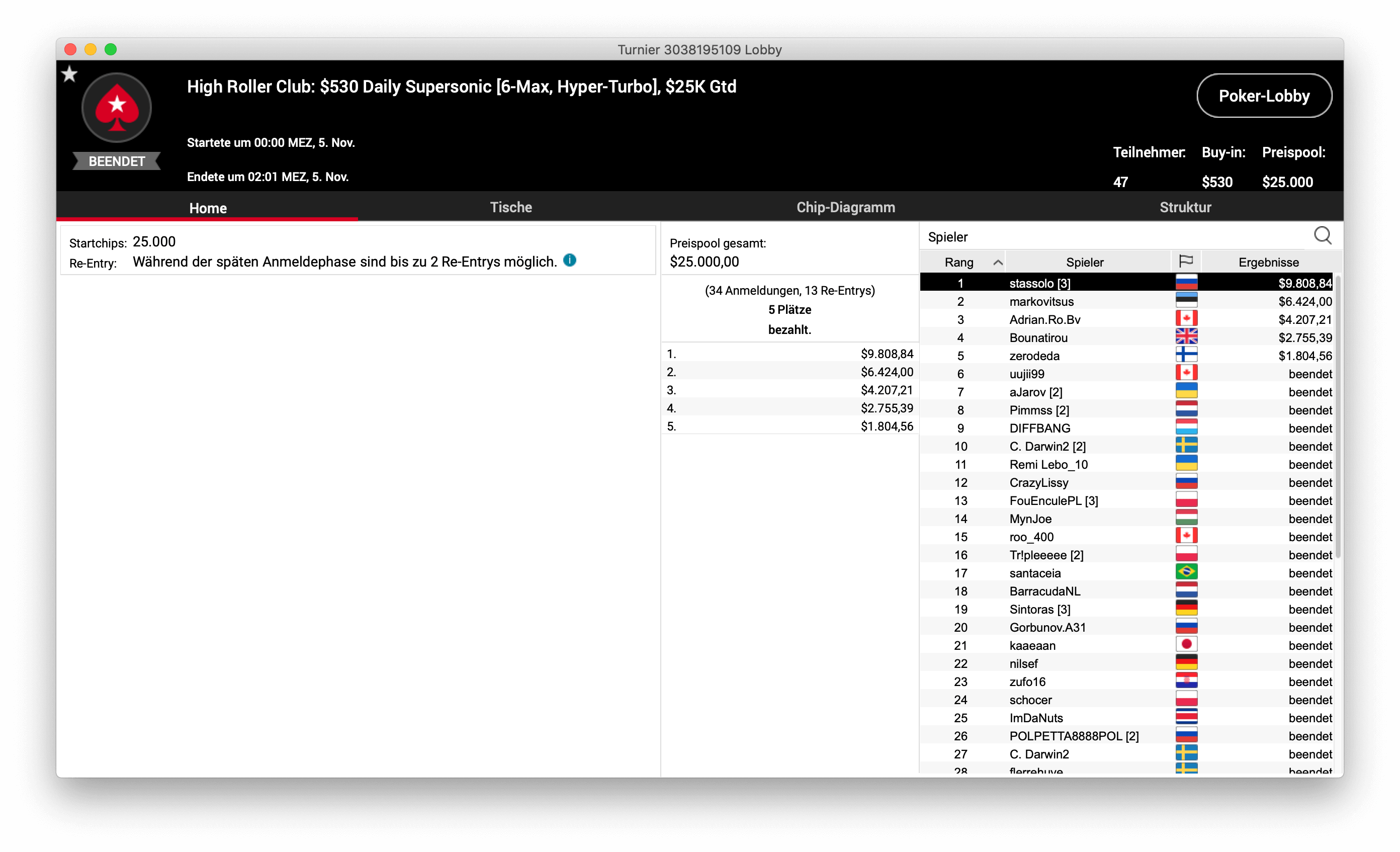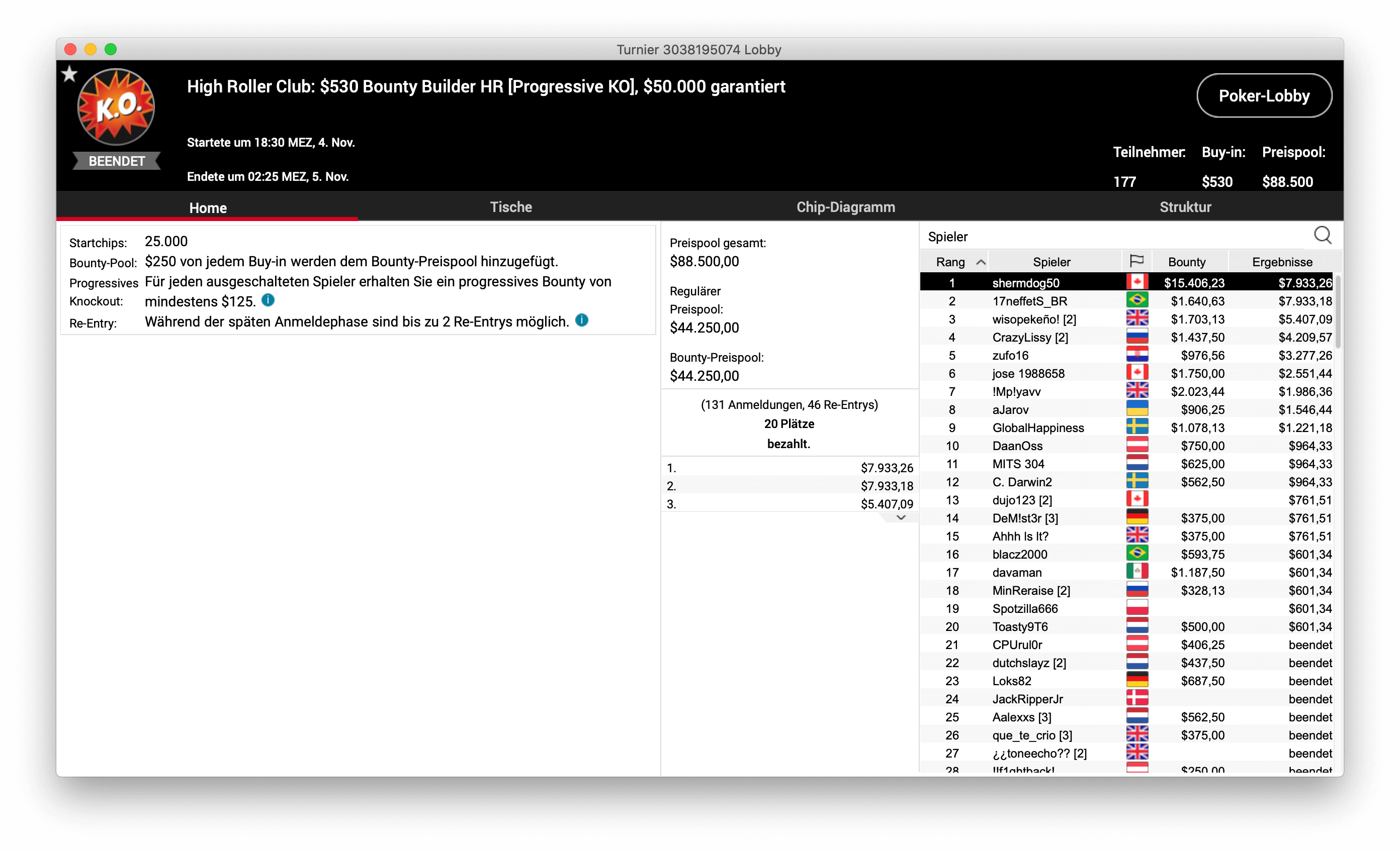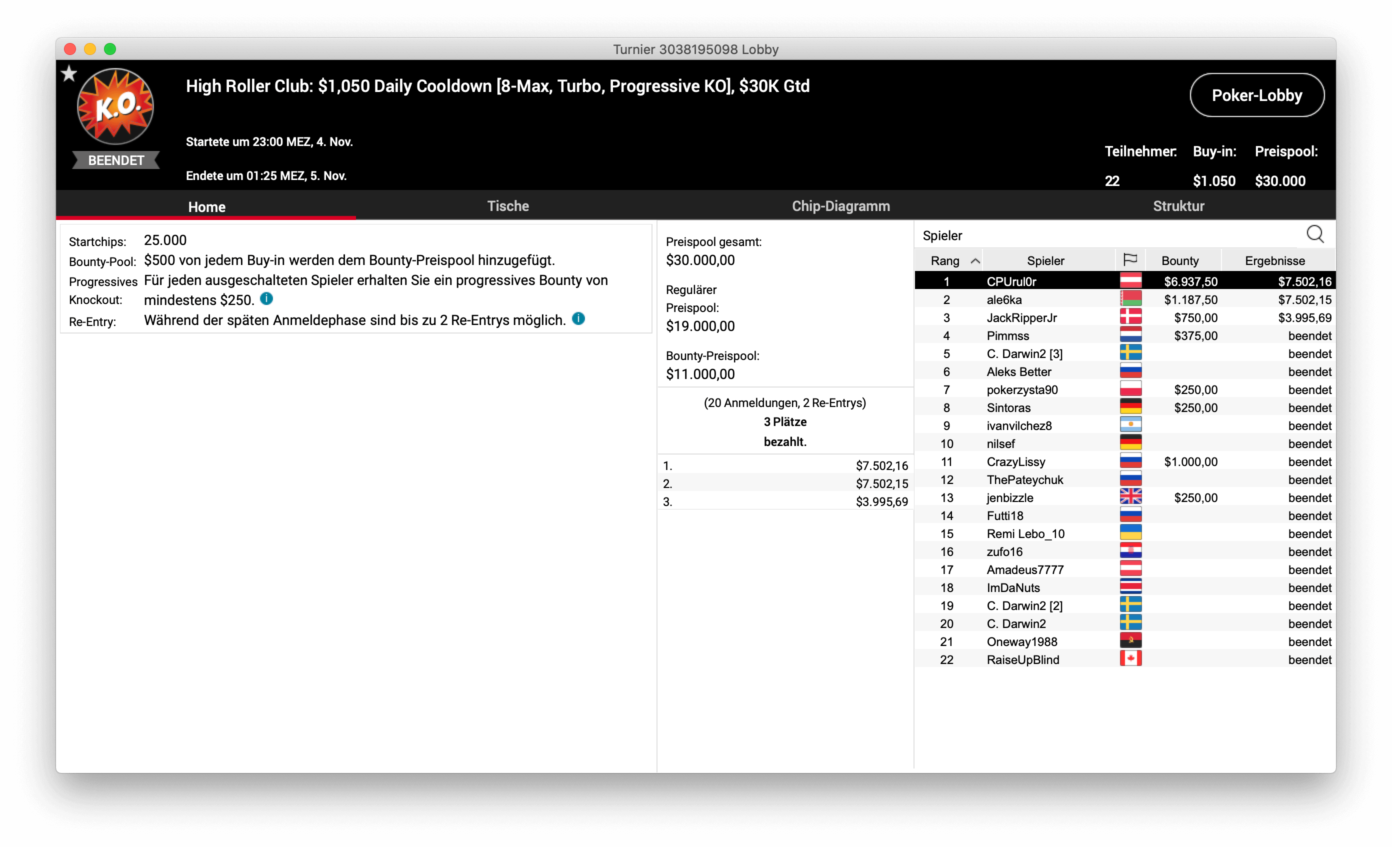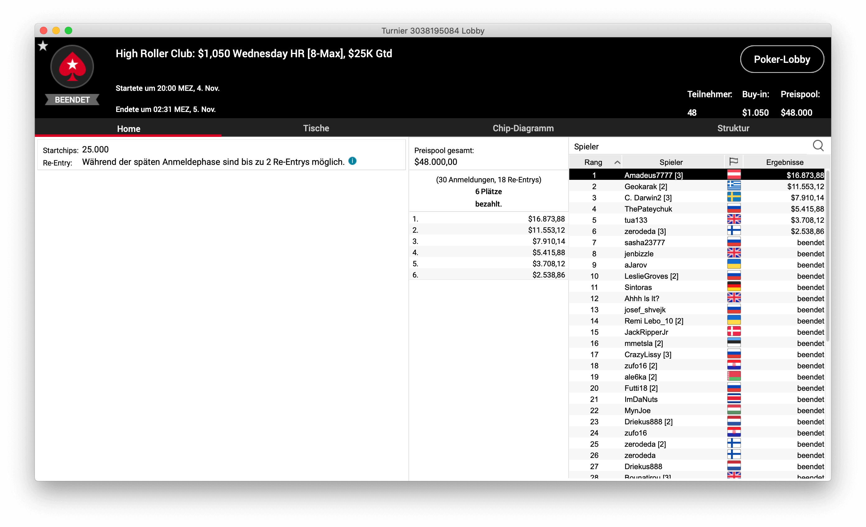 Mit seiner dritten Bullet schnappte sich „Amadeus7777“, der in letzter Zeit immer wieder auf PokerStars erfolgreich war, das $1.050 Wednesday HR mit $48.000 Preispool. Für den Sieg durfte er $16.873 Prämie einsacken.