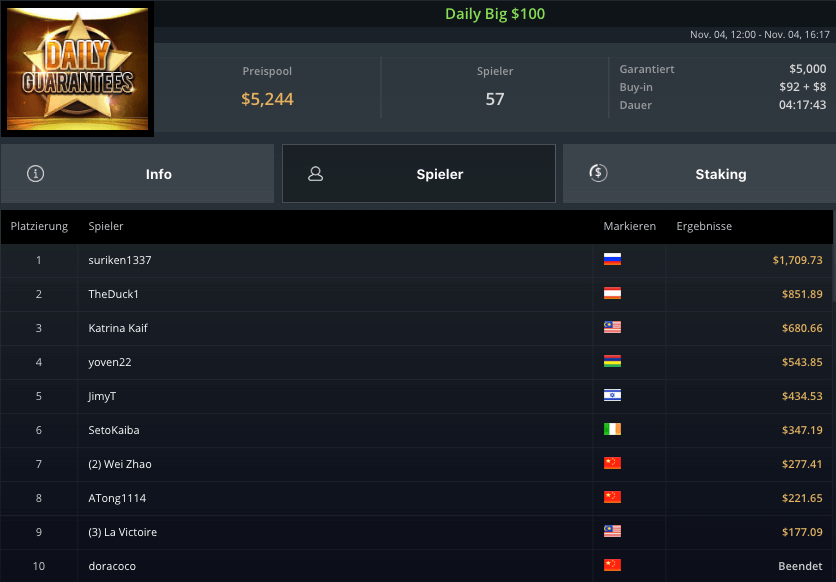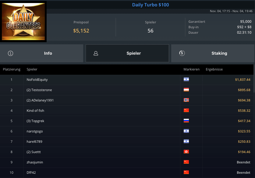 Ansonsten konnte noch „Testosterone“ aus Österreich sich beim Daily Turbo $100 auf Platz 3 spielen, dafür gab es $716. Der Sieg ging an „Leeroy22“ für $1.799.