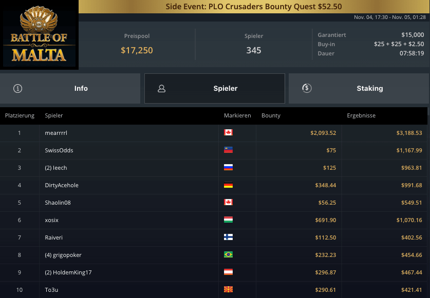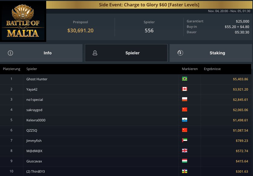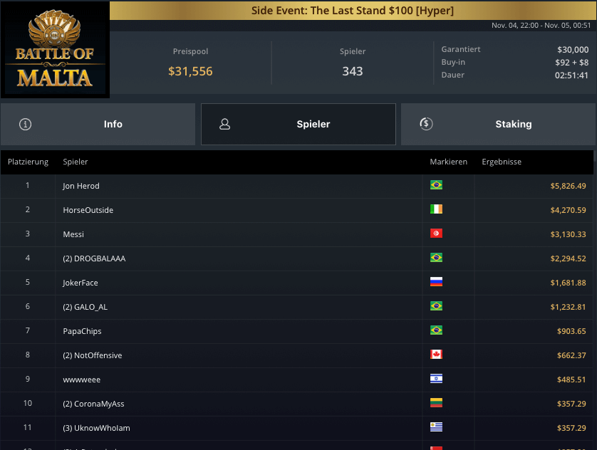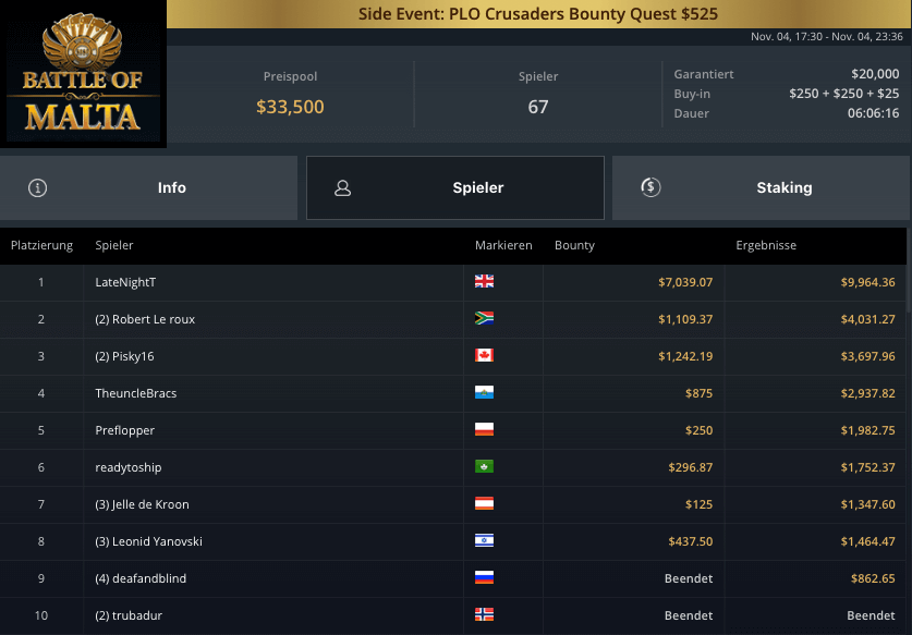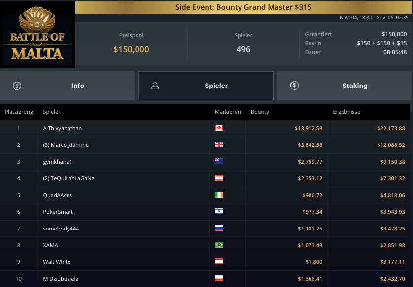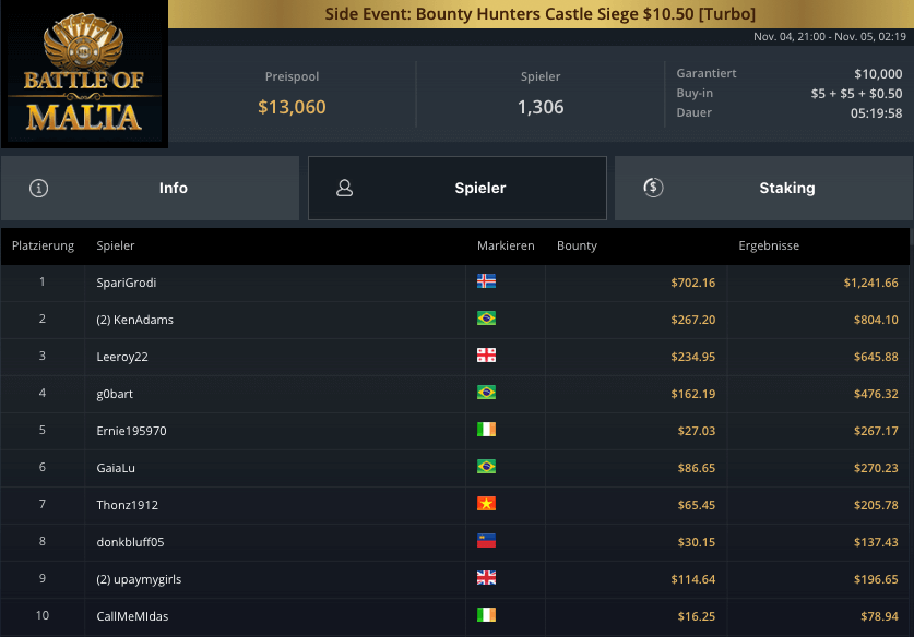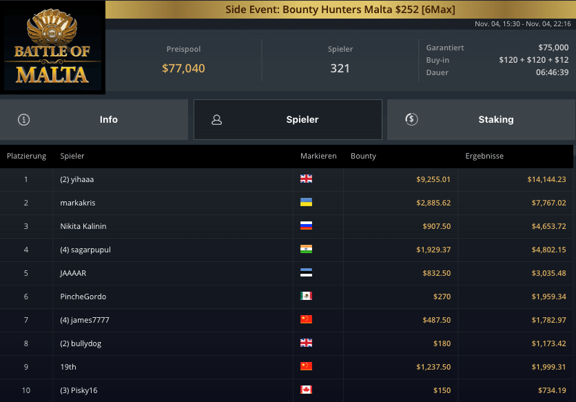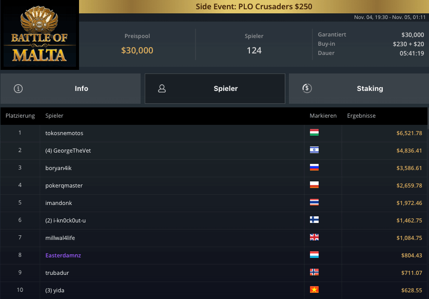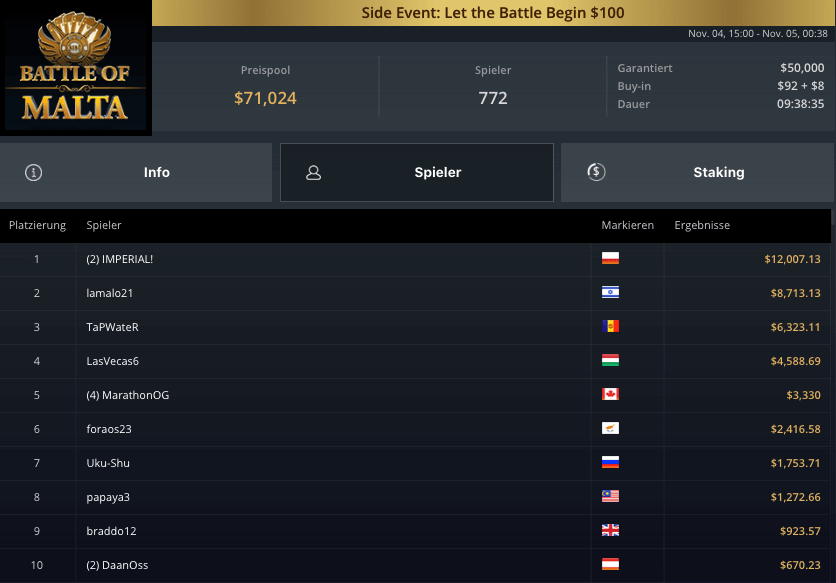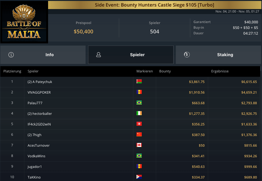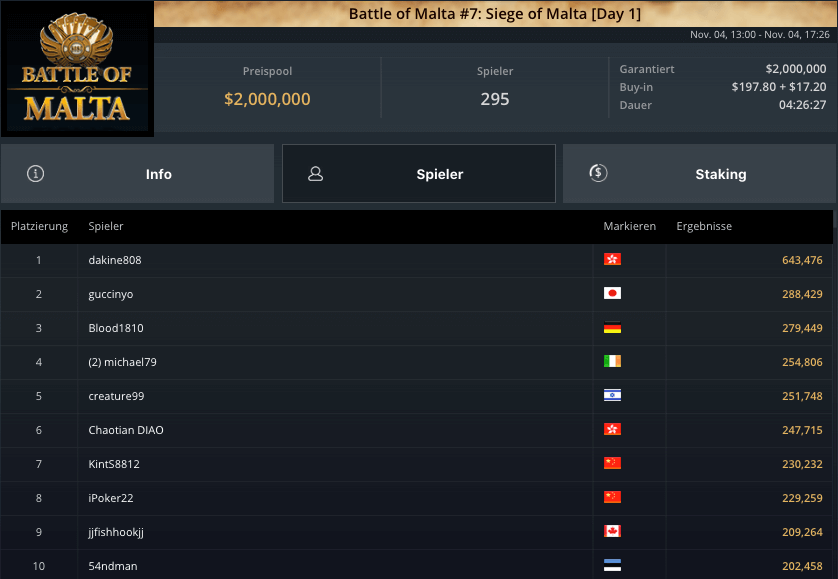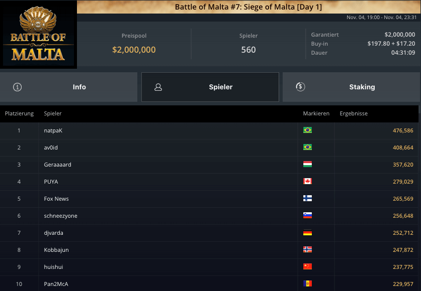 Im „Siege of Malta“ Hauptevent kamen 855 Entries für das $215 Buy-In hinzu. $2.000.000 Garantie warten auf die Spieler, es gibt weitere Flights in den nächsten Tagen.