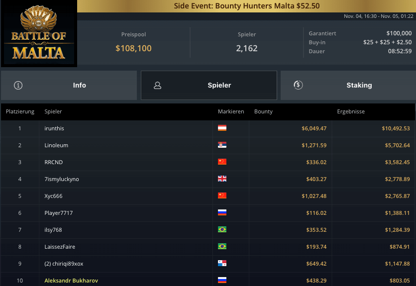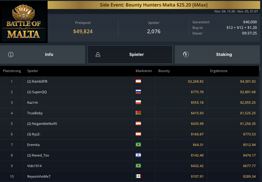 Die österreichischen Siege gehen an „irunthis“, der beim $52.50 Side Event mit $108.100 Preispool bei 2.162 Entries für $10.492 gewinnen konnte und „Ramb0FP“, der das $25.20 6-Max gewann und dafür $4.301 einsacken durfte.