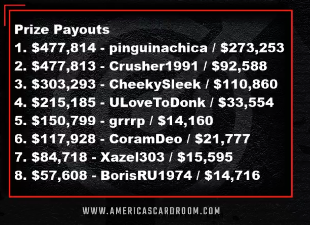 „pinguinchica“ gewann das Turnier am Ende und setzte sich so gegen 2.710 Entries durch. Für die Erstplatzierung gab es $477.814, $273.253 erspielte er mit Bounties. Somit gab es über $750.000 für seinen Sieg beim The Venom.