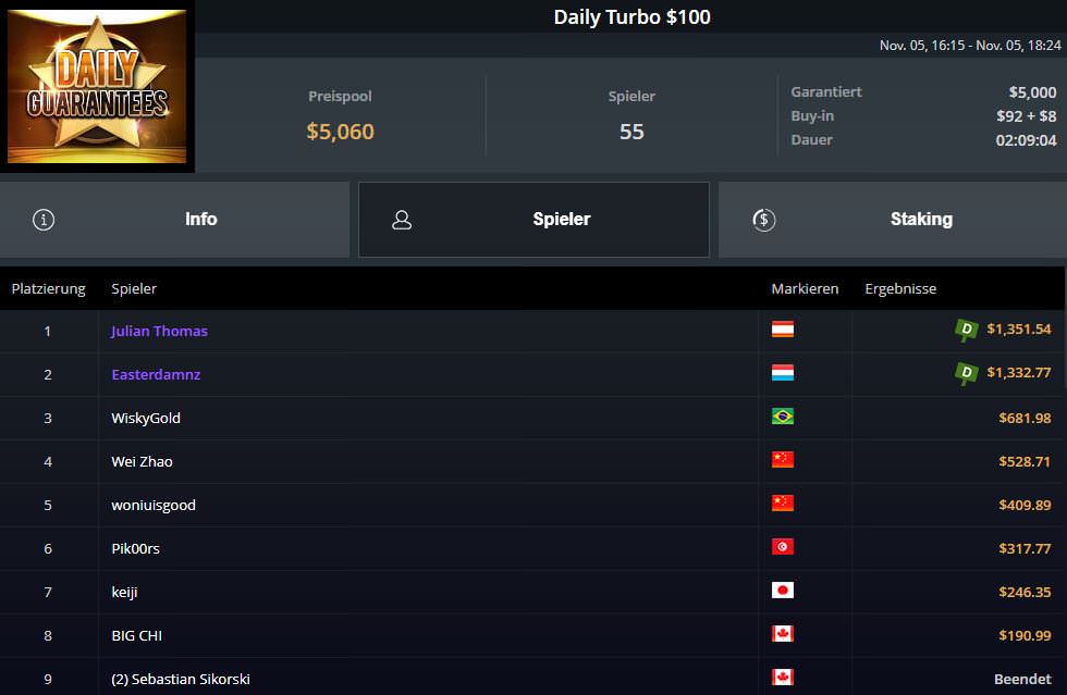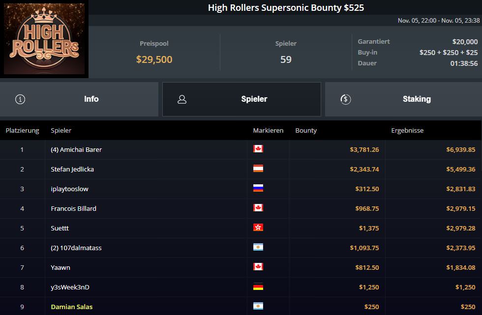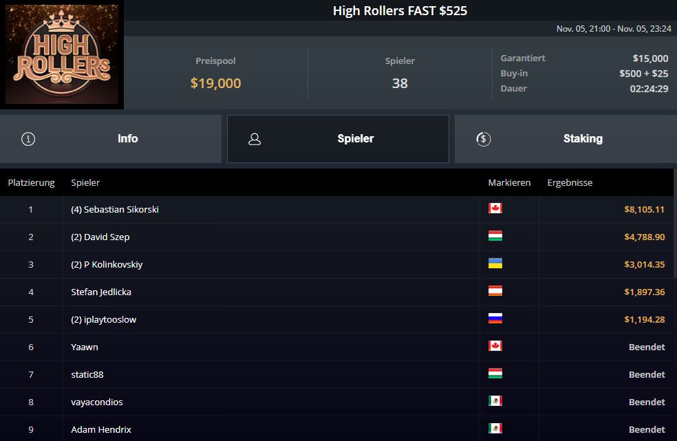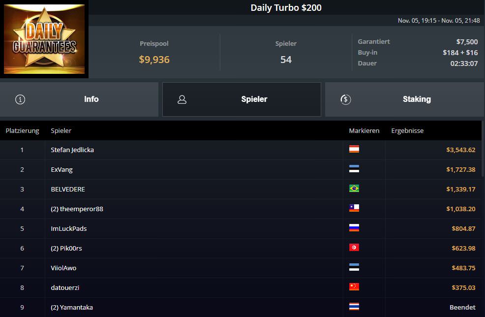 Sehr erfolgreich unterwegs war einmal mehr der Österreicher Stefan Jedlicka. Er gewann zunächst das $200 Daily Turbo für $3.543,62 Preisgeld, legte dann Platz vier für $1.897,36 beim $525 High Rollers FAST und Platz zwei für $5.499,36 (inkl. Bounties) beim $525 High Rollers Supersonic Bounty nach.