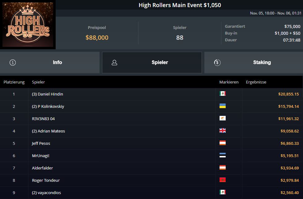Beim $1.050 High Rollers Main Event verwies Daniel Hindin aus Mexiko Kolinkovskiy ($15.794,14) und R3V3N83 04 ($11.961,32) auf die Plätze zwei und drei und kassierte $20.855,15.