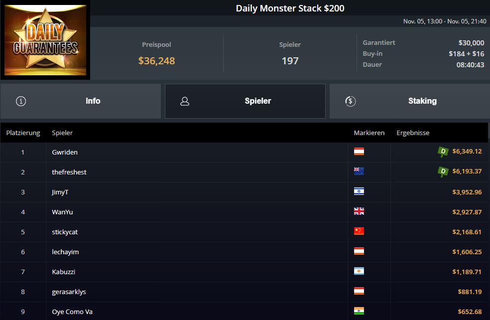 Auch der Österreicher Gwriden feierte einen Turniersieg und zwar beim $200 Daily Monster Stack. Heads-up einigte er sich zunächst mit thefreshest ($6.193,37) aus Neuseeland auf einen Deal, sodass am Ende $6.349,12 Preisgeld raus sprangen.