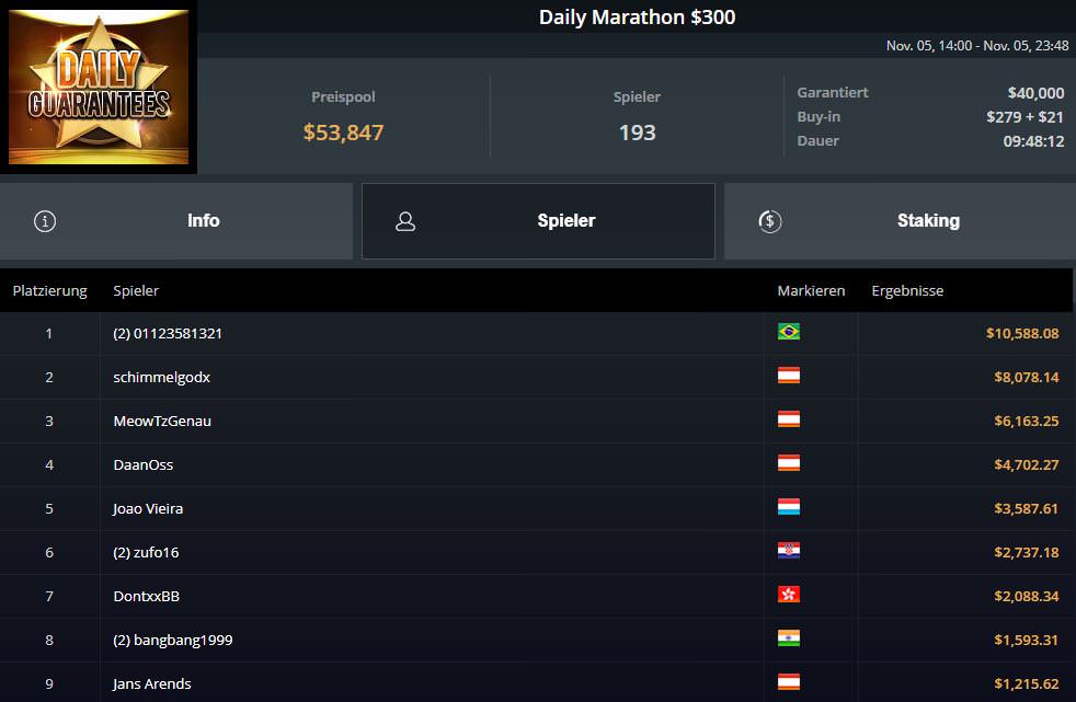 Beim $300 Daily Marathon bissen sich MeowTzGenau und schimmelgodx am Brasilianer 01123581321 ($10.588,08) die Zähne aus und mussten sich mit den Plätzen drei und zwei für $6.163,25 bzw.$8.078,14 zufrieden geben.