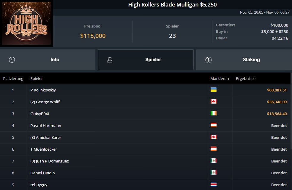Den höchsten Scheck des Tages holte Pavlo Kolinkovskiy aus der Ukraine. Er gewann das $5.250 High Rollers Balde Mulligan vor George Wolff ($36.348,09) und damit satte $60.087,51 Prämie. Pascal Hartmann und Thomas Mühlöcker erreichten den Final Table, aber nicht die bezahlten drei Plätze.