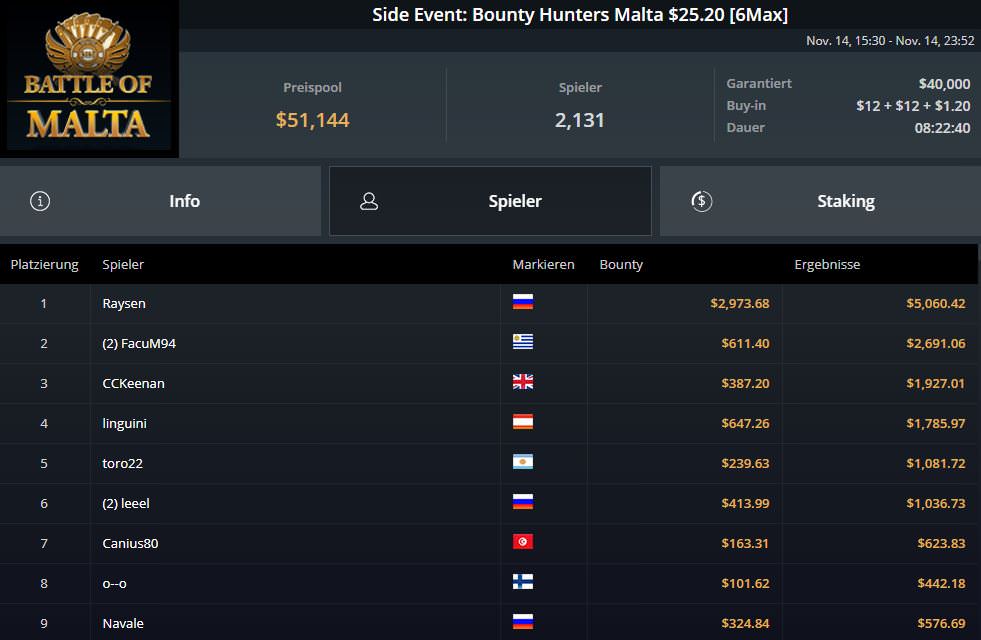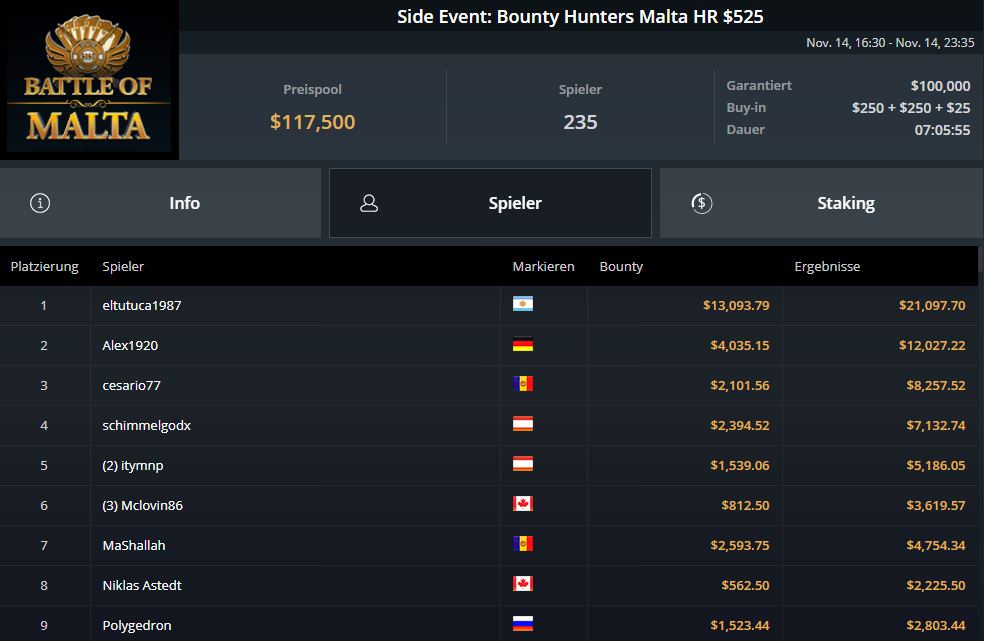 Am lukrativsten war die Ausbeute von Alex1920, der sich beim $525 Bounty Hunters Malta HR erst Heads-up dem Argentinier eltutuca1987 ($21.097,70) geschlagen geben musste und inklusive Bounties $12.027,22 abräumte.