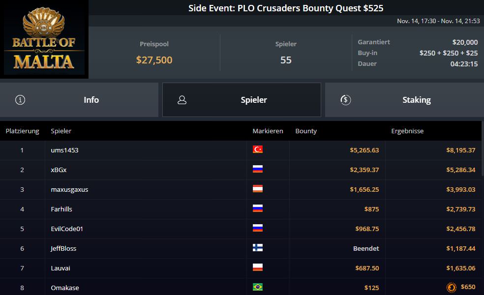 Einen dritten Platz verbuchte maxusgaxus aus Österreich beim $525 PLO Crusaders Bounty Quest, ihm inklusive Bounties $3.993,03 in die Bankroll spülte.